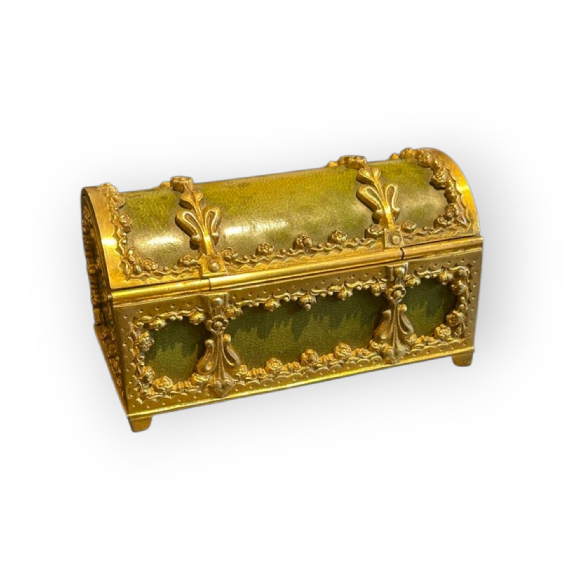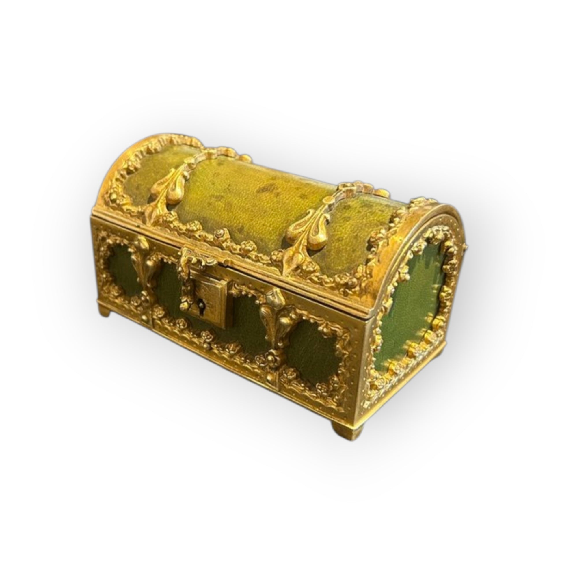 A refined Louis XVI period French casket, elegantly covered in natural galuchat (stingray skin) in a soft olive‑green tone and mounted with finely cast gilt ormolu (gilded bronze). The domed lid, rounded corners, and crisp neoclassical mounts reflect the restrained luxury of the late 18th century, when galuchat was one of the most fashionable materials in Parisian decorative arts.