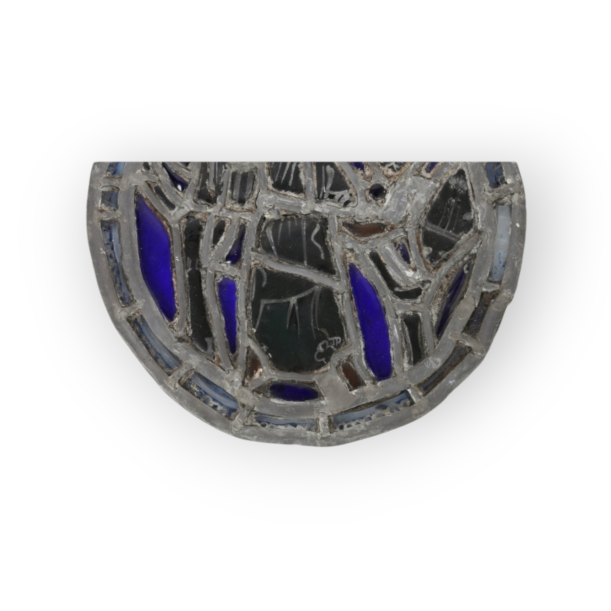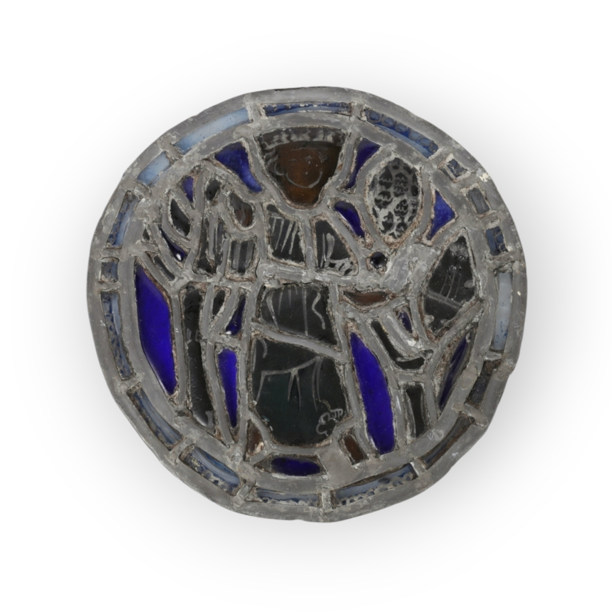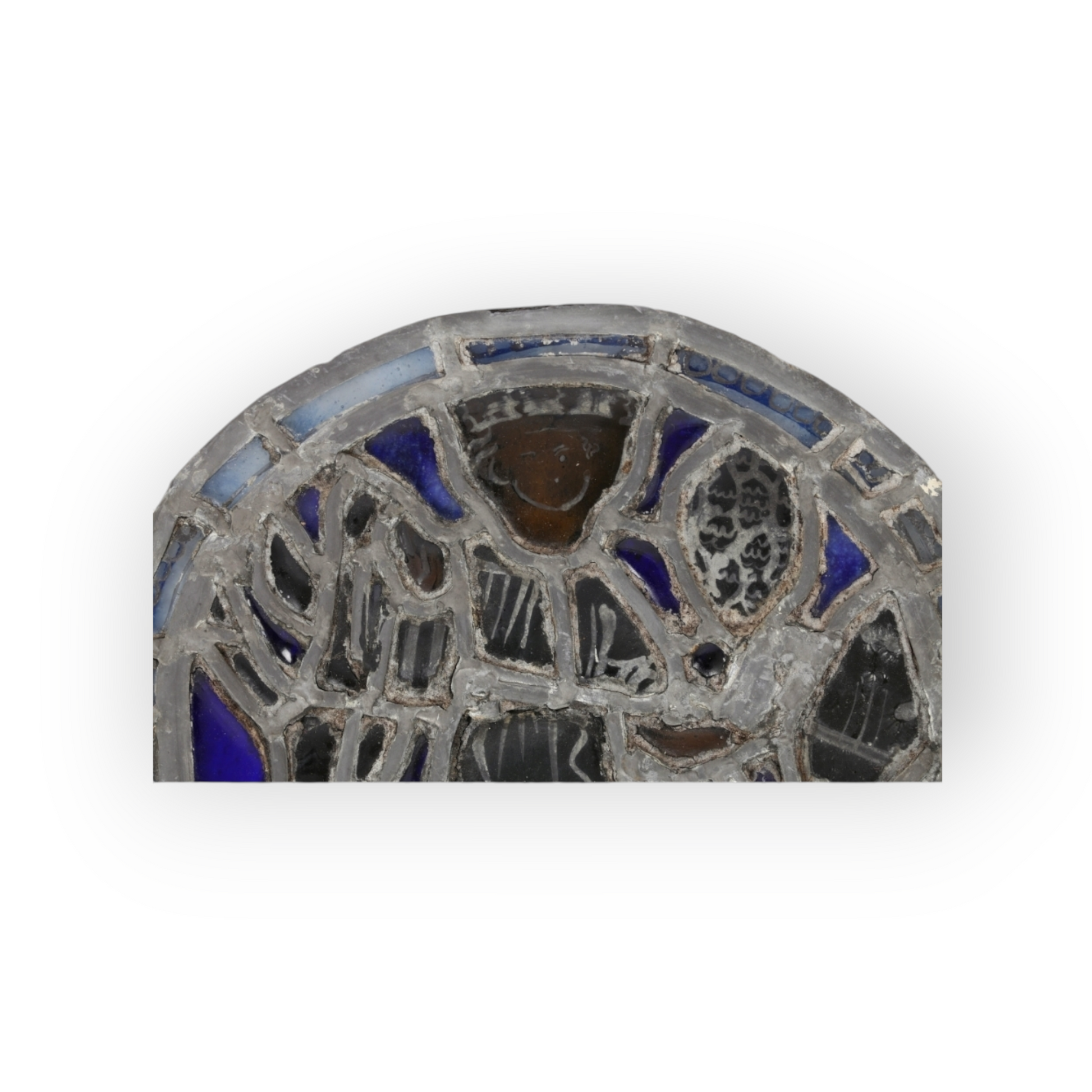 Depicting a monarch, possibly Edward I. Glass fragments of this panel are medieval with some later pieces. The lead work is later.