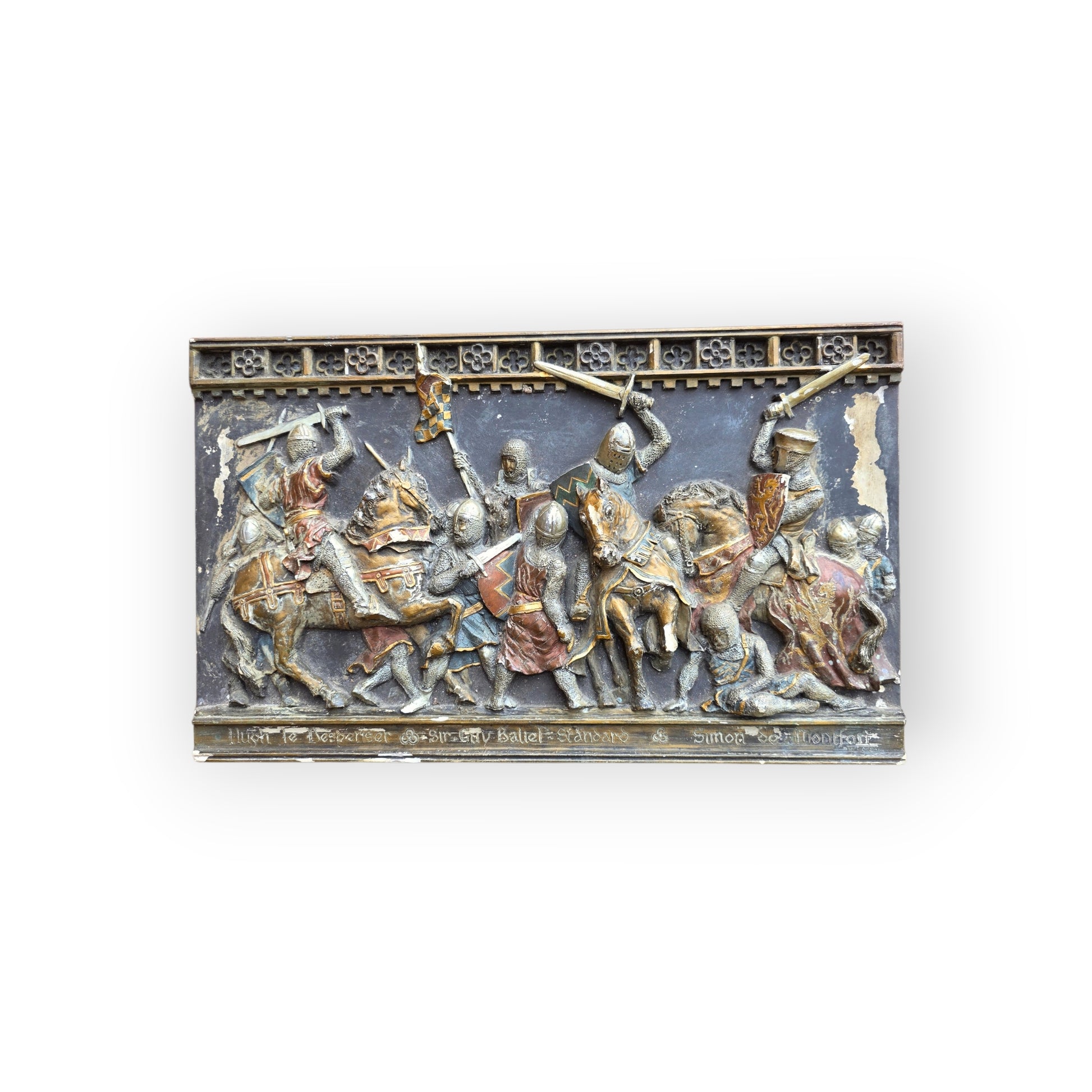 This impressive large-scale plaster plaque presents a vivid medieval battle scene: multiple armoured knights on horseback clash with raised swords, shields and flowing caparisons. The sculptural depth is striking — horses rear, riders twist in combat, and the entire composition surges with movement. The original polychrome finish, with metallic highlights and earth-toned pigments, enhances the drama and gives the panel a richly historic presence.