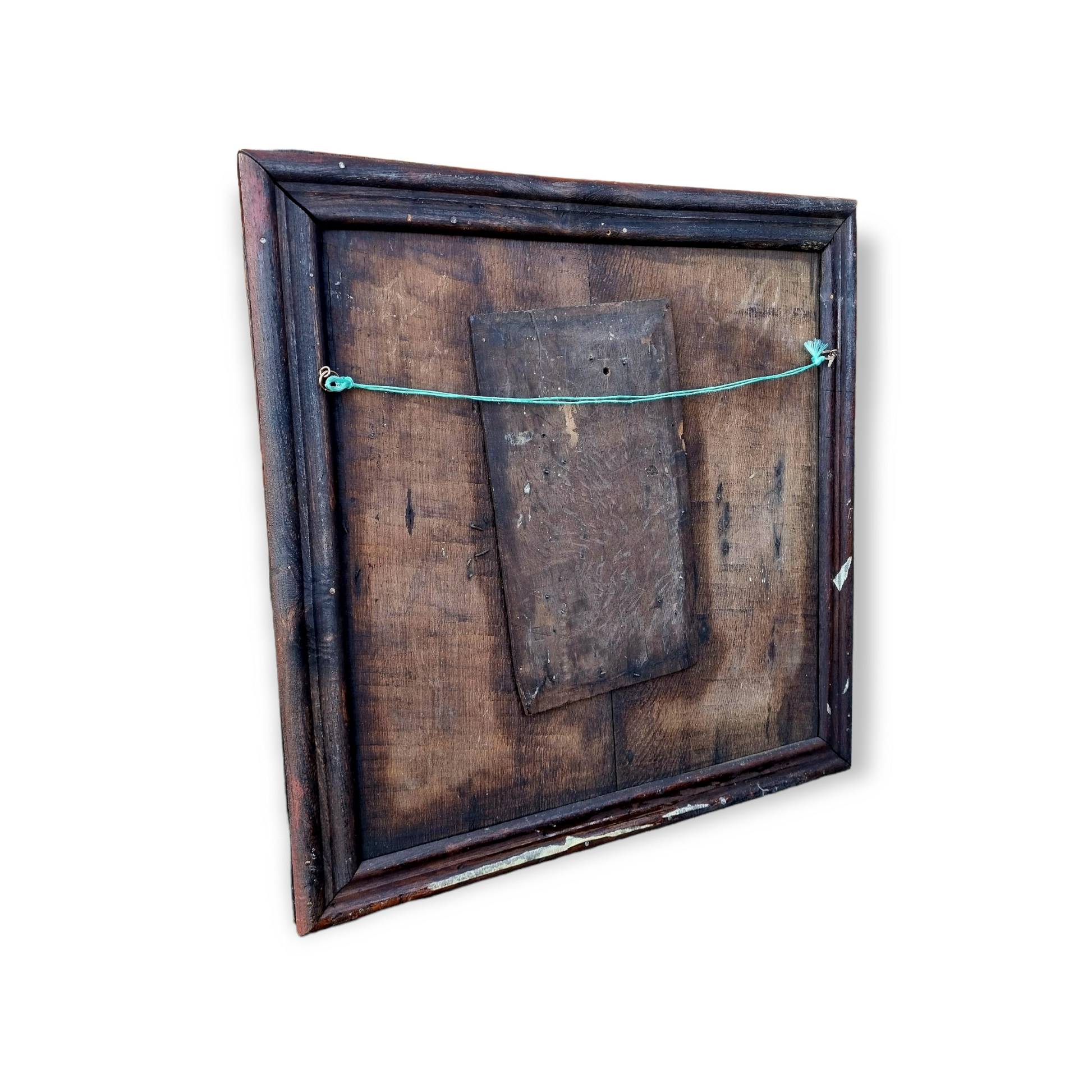 Of geometric form and carved from oak, the centre bears a "Romayne" head flanked by four decorative corner spandrels, each surrounded by moulding and inset with a design of carved fruit and foliage.