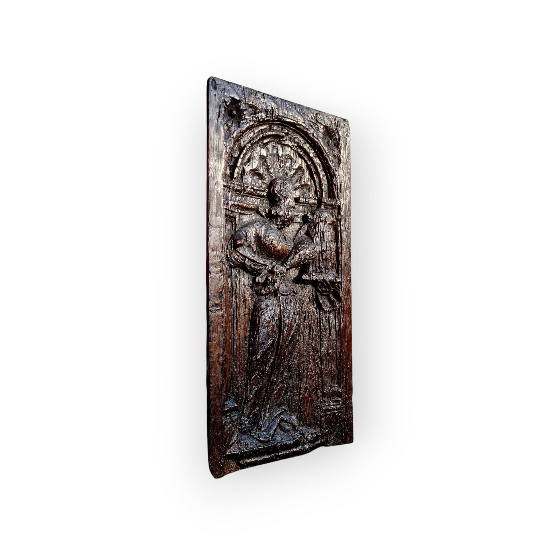 Mid 16th-Century Antique Carved Oak Panel, Depicting Saint Barbara, The Patron Saint of Artillerymen, Miners & Engineers
