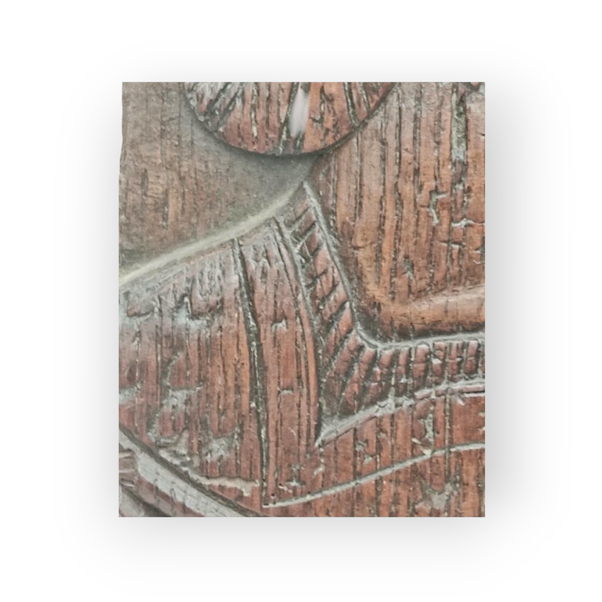 The female sitter portrayed with her head and shoulders in side profile, Below, two stylised beasts stand side by side, their heads turned outwards.