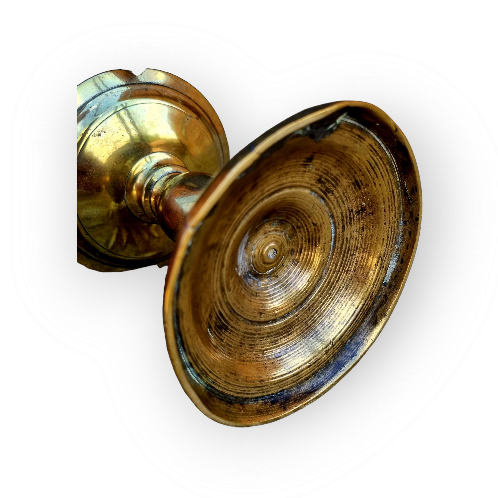 A mid-17th-century Dutch “Heemskirk” candlestick, crafted in four parts with a flared socket and knopped stem — a classic example of early brass lighting. Its sculptural form and rich patina speak to centuries of use and care, offering collectors a rare glimpse into the domestic and ceremonial life of the Dutch Golden Age. A museum-worthy piece for connoisseurs of metalware and primitive lighting.