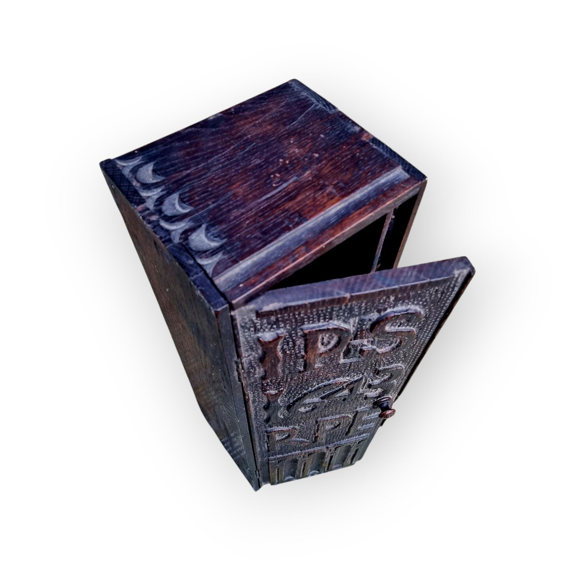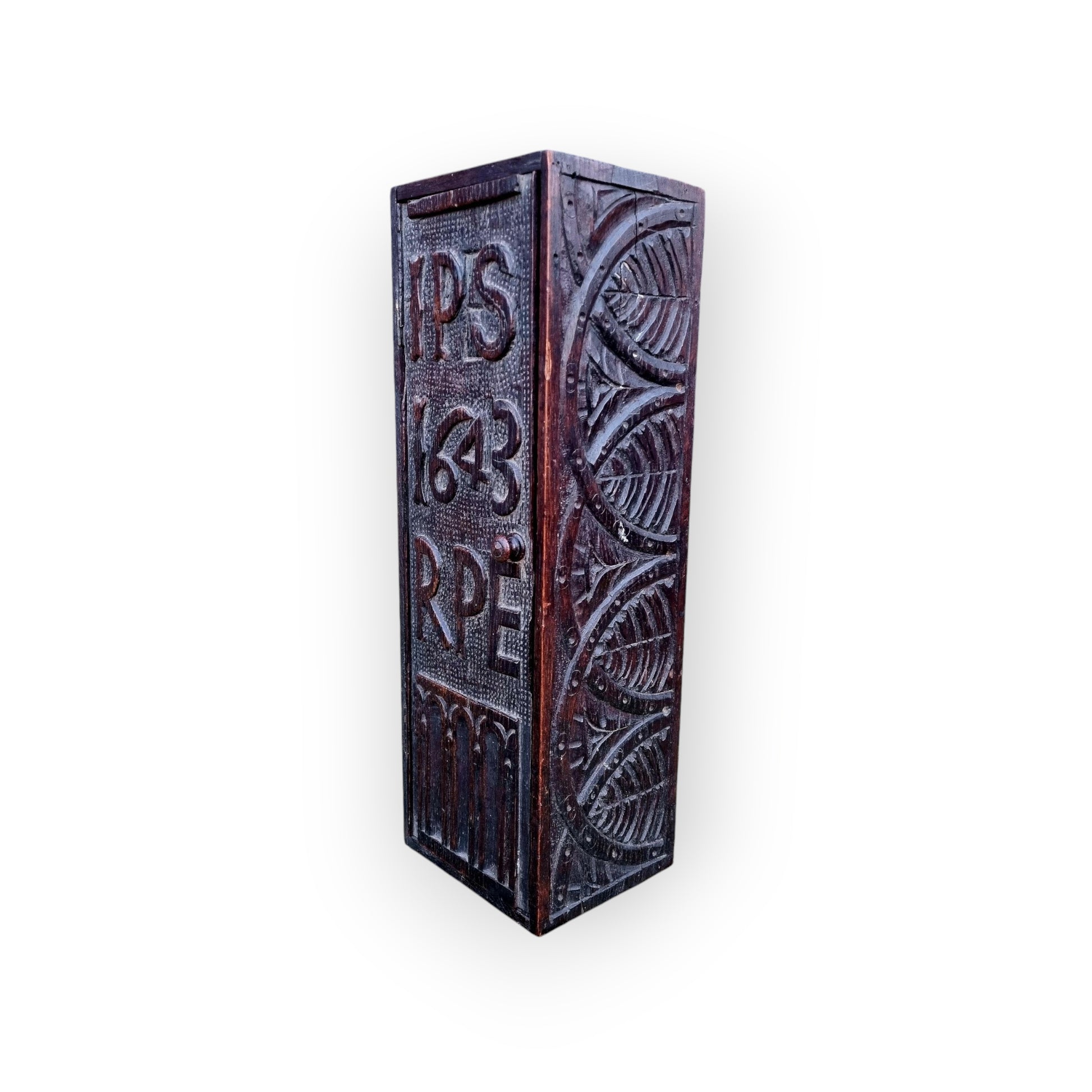 With a single hinged door with a turned wooden handle, the front carved with the initials "IPS" & "RPE" and bearing a date of "1643". The "IPS" has been carved over an older "E". The panel also incorporates punched decoration and carved nulling at its base.