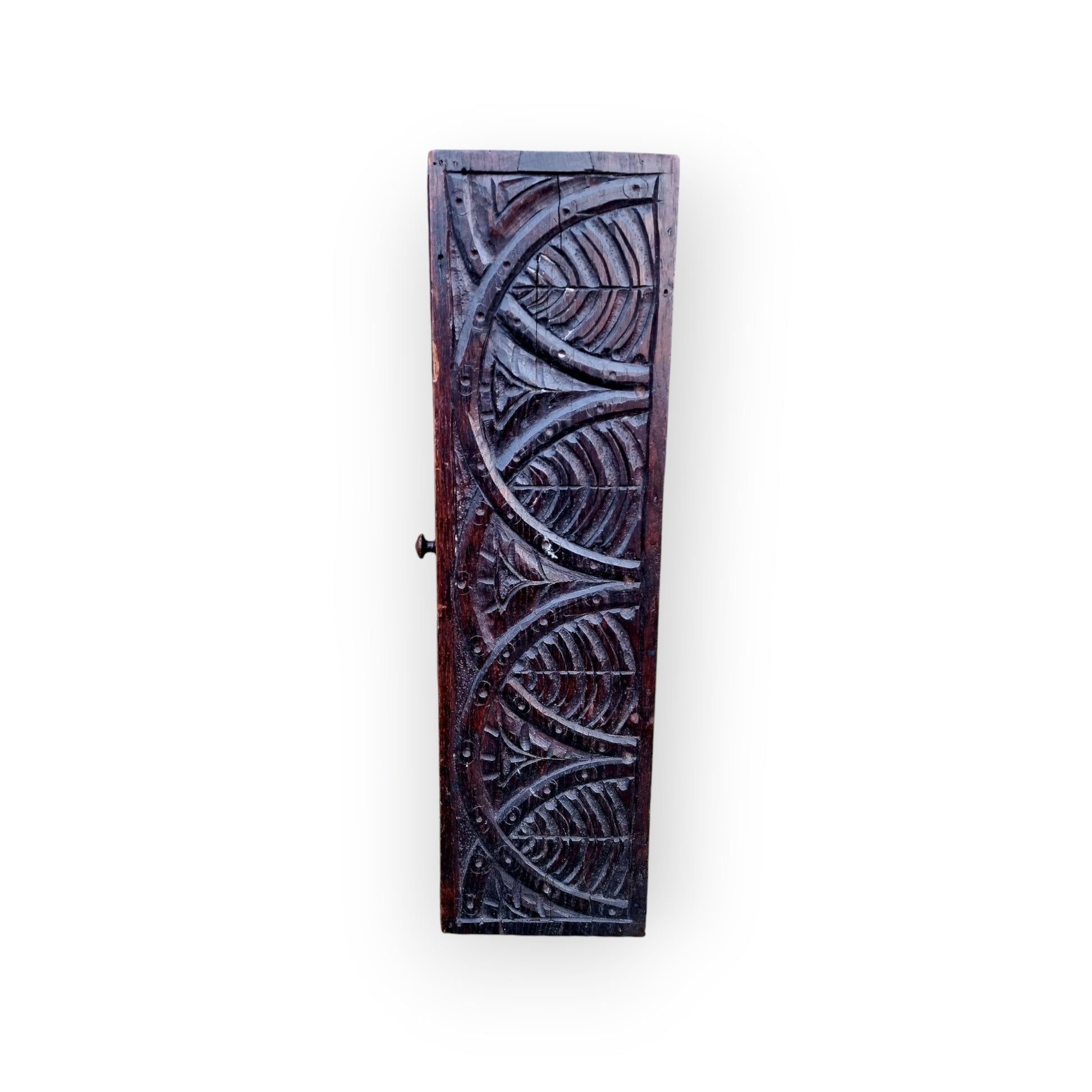 The left upright plank, which flanks the door, has carved lunettes to the outer surface. The other plank, to the right of the door, is of plain form. The top plank is carved with nulling. The base plank and backboard are again of plain form (the backboard is made from deal/pine).