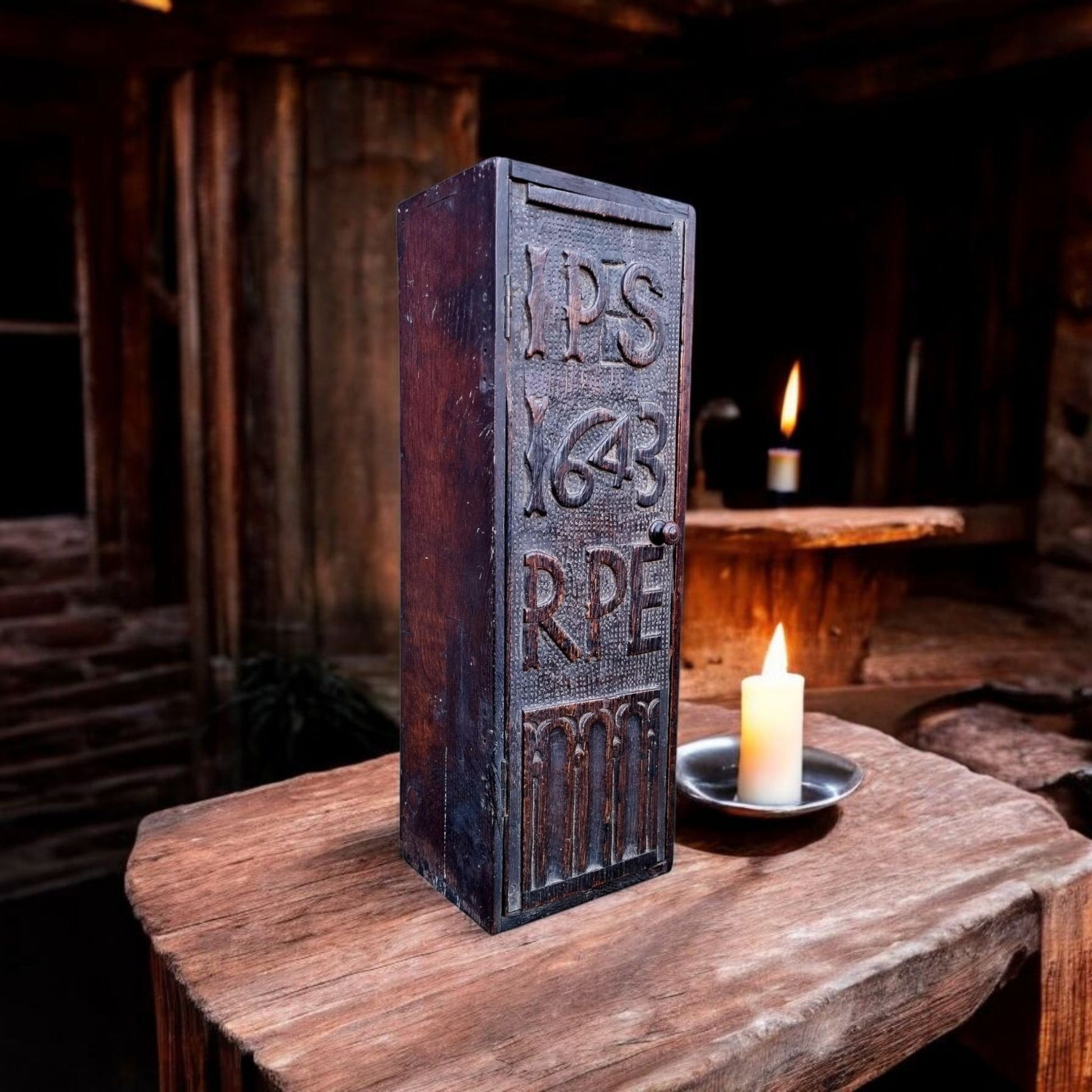 Mid 17th-century English Antique Oak Candlebox, The Front Inscribed "IPS 1643 RPE"