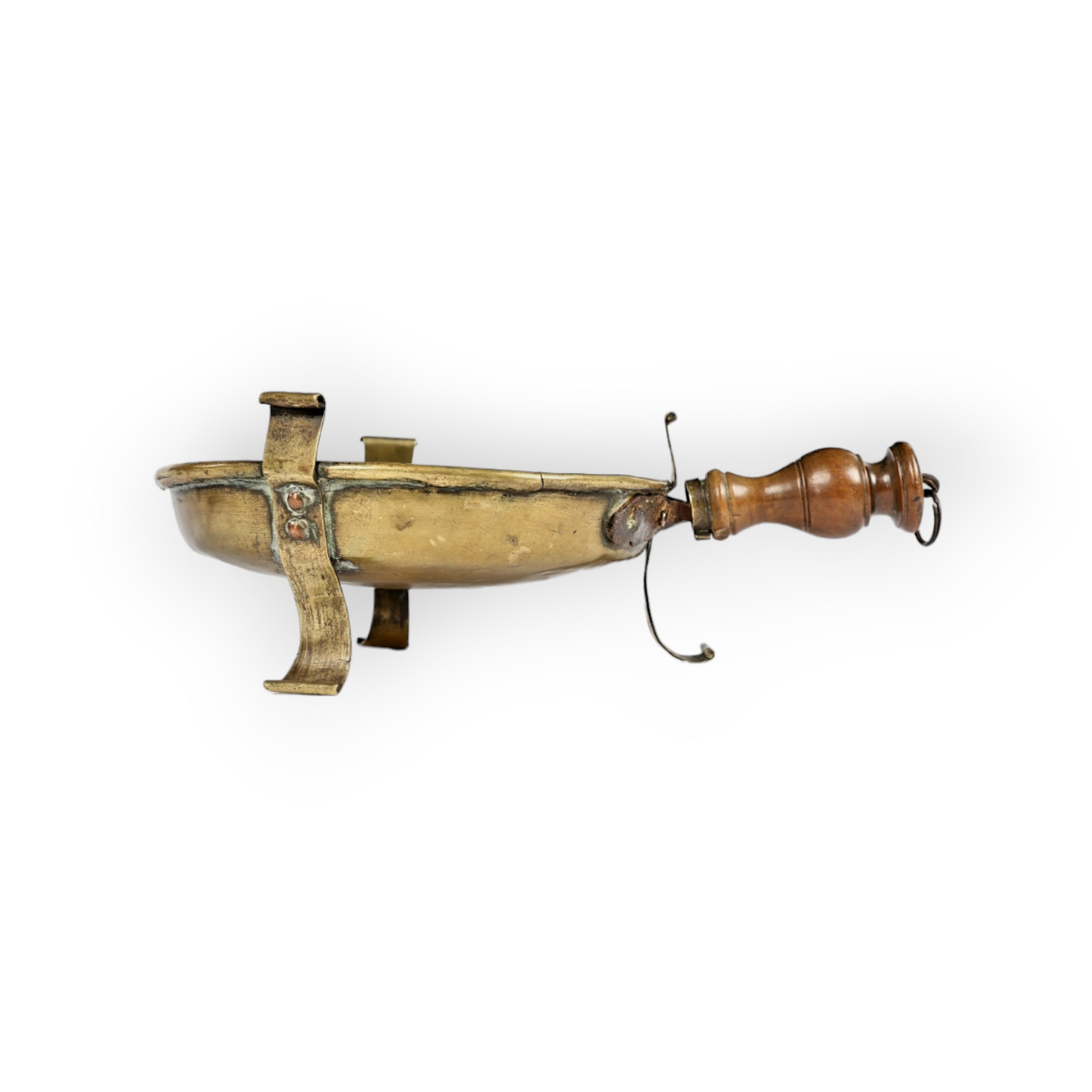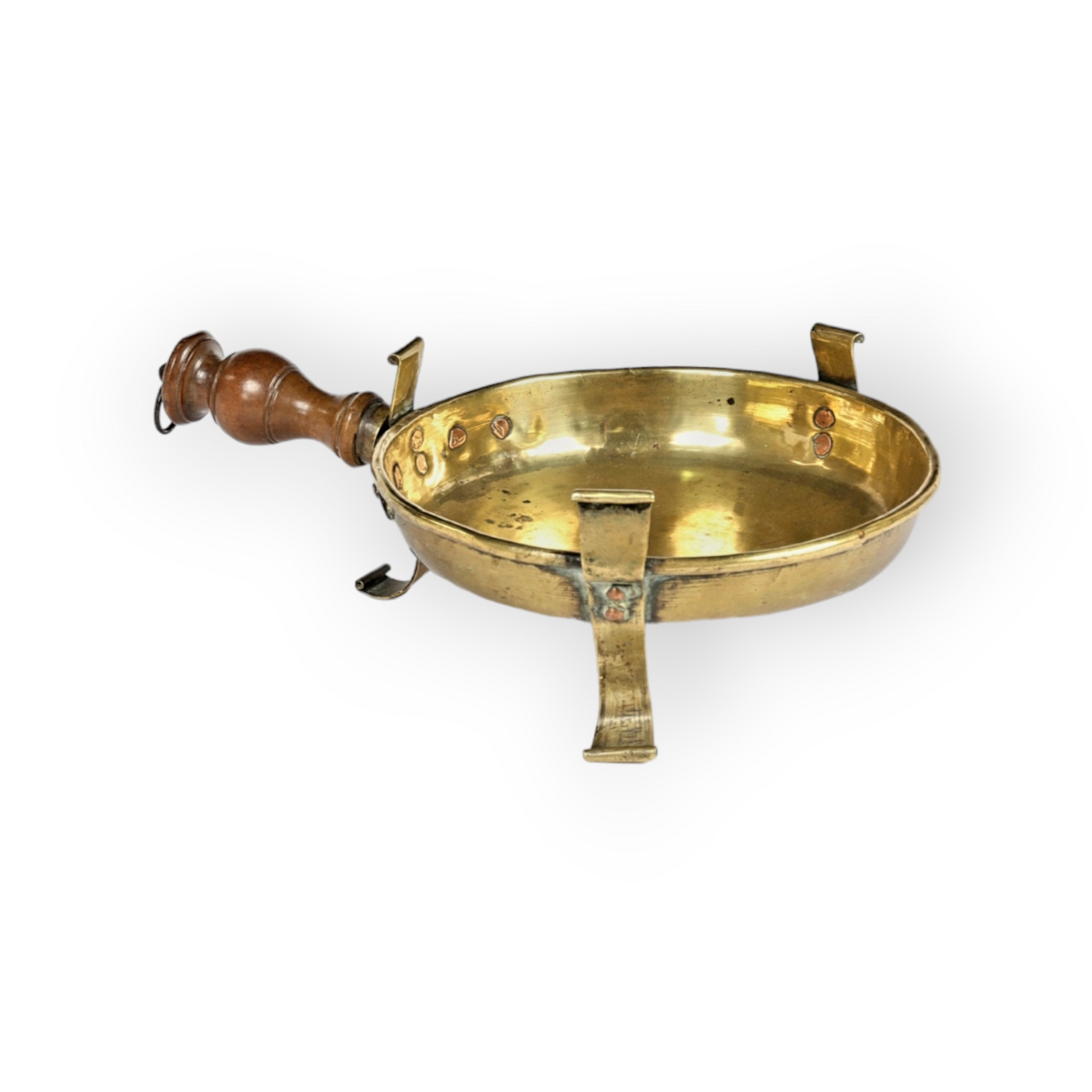 The wide, shallow bowl with rolled rim, on three scrolled strap feet attached with copper rivets to the sides of the bowl, the short baluster-turned fruitwood handle again with copper rivets and an iron hanging loop terminal.