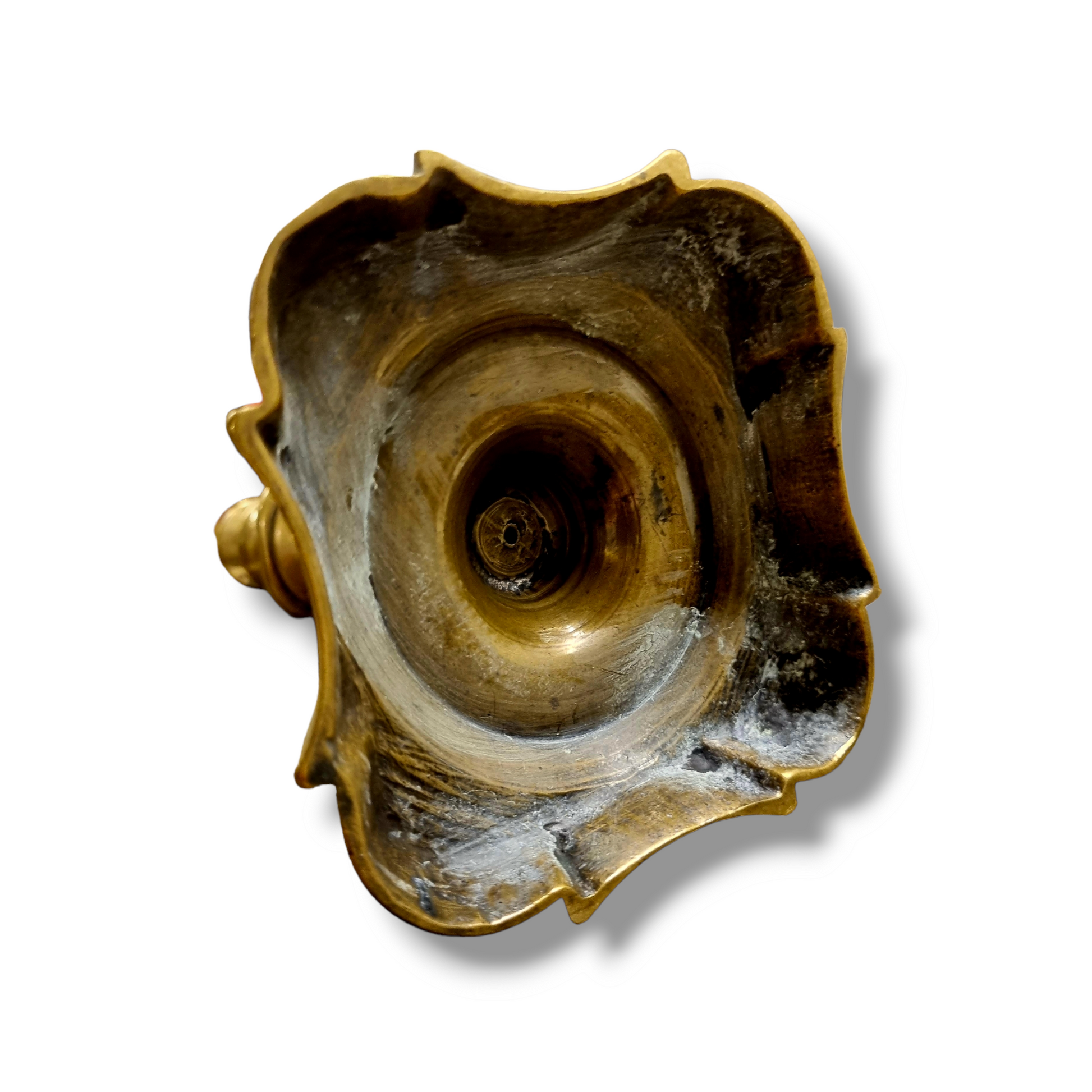 A fine mid-18th-century English brass-seamed candlestick, dating to circa 1745–1765. Featuring a single candle socket over a double-knopped stem and raised foot, this piece exemplifies Georgian lighting design with its elegant proportions and functional simplicity. The seamed construction and warm patina speak to its age and authenticity, making it a desirable addition to any collection of antique brassware or period lighting.