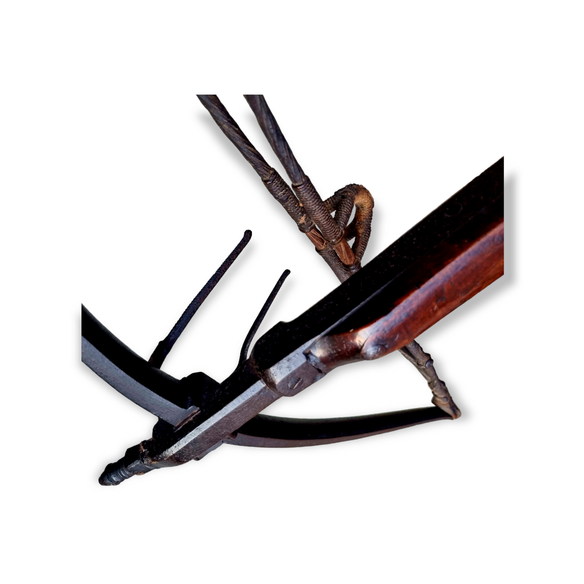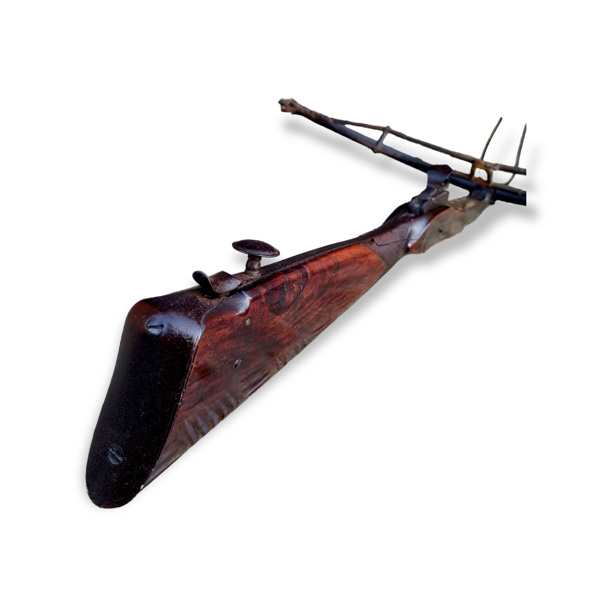 A robust mid-18th-century English stonebow, probably by Barker of Wigan, featuring a steel bow retained by a pair of long steel side plates and a central release mechanism. Originally used for hunting small game, this example is unusually complete and well-preserved, with a strong patina and functional tension.