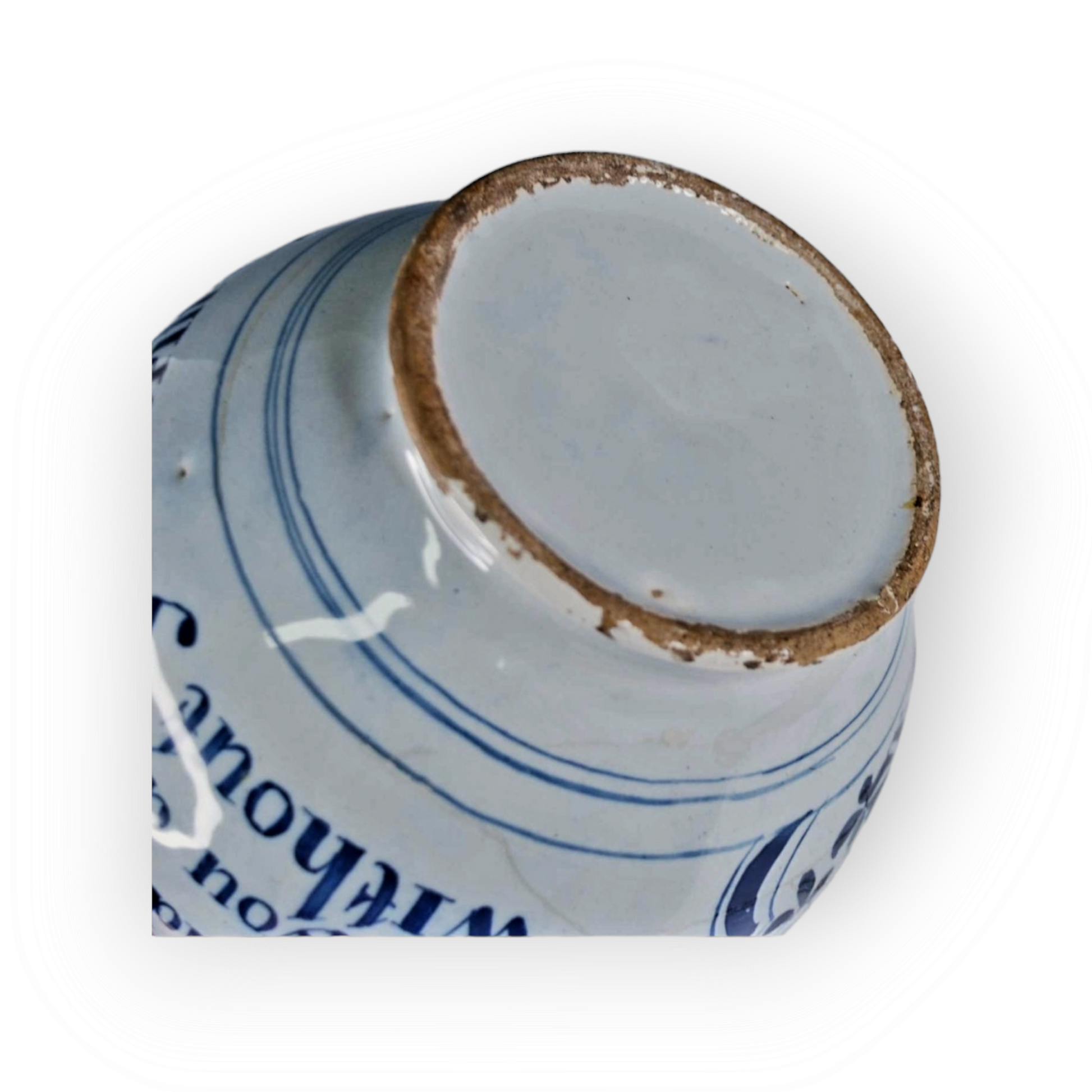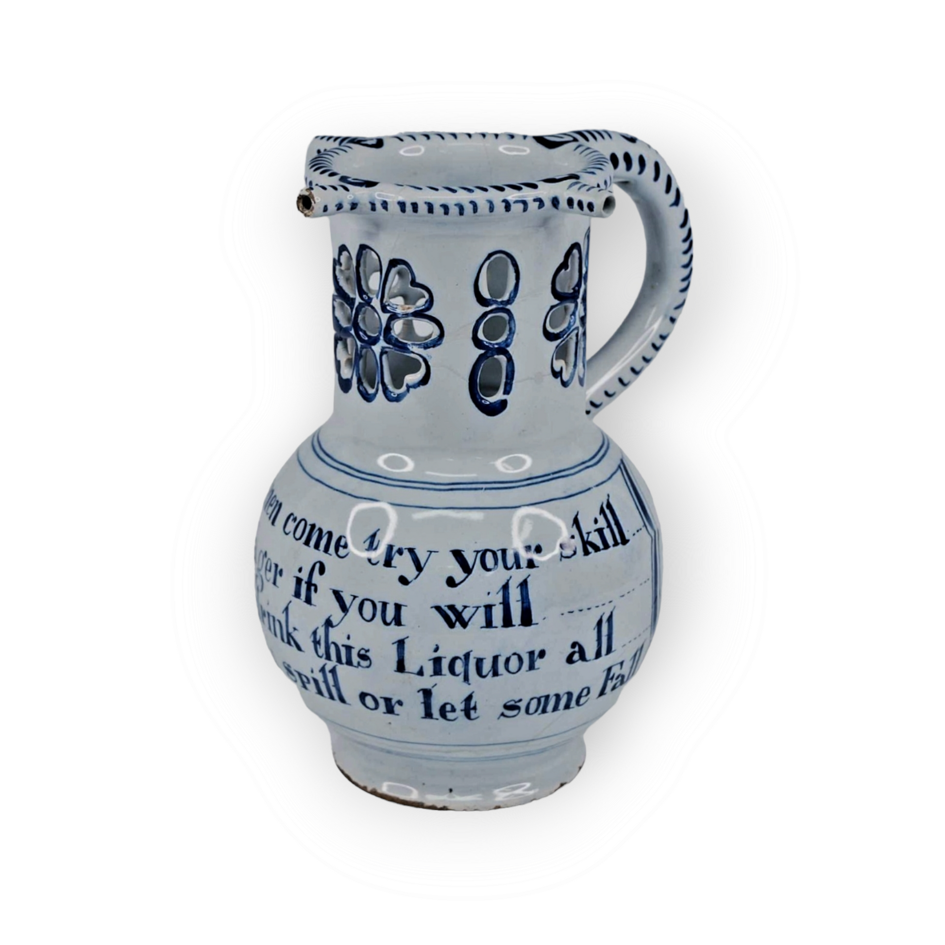 Decorated in underglaze blue. With its pierced neck and three spouts, it embodies the whimsical ingenuity of Georgian ceramics — a drinking vessel designed to entertain and confound. For collectors of Delftware and historic tableware, this jug is a standout piece of functional artistry.