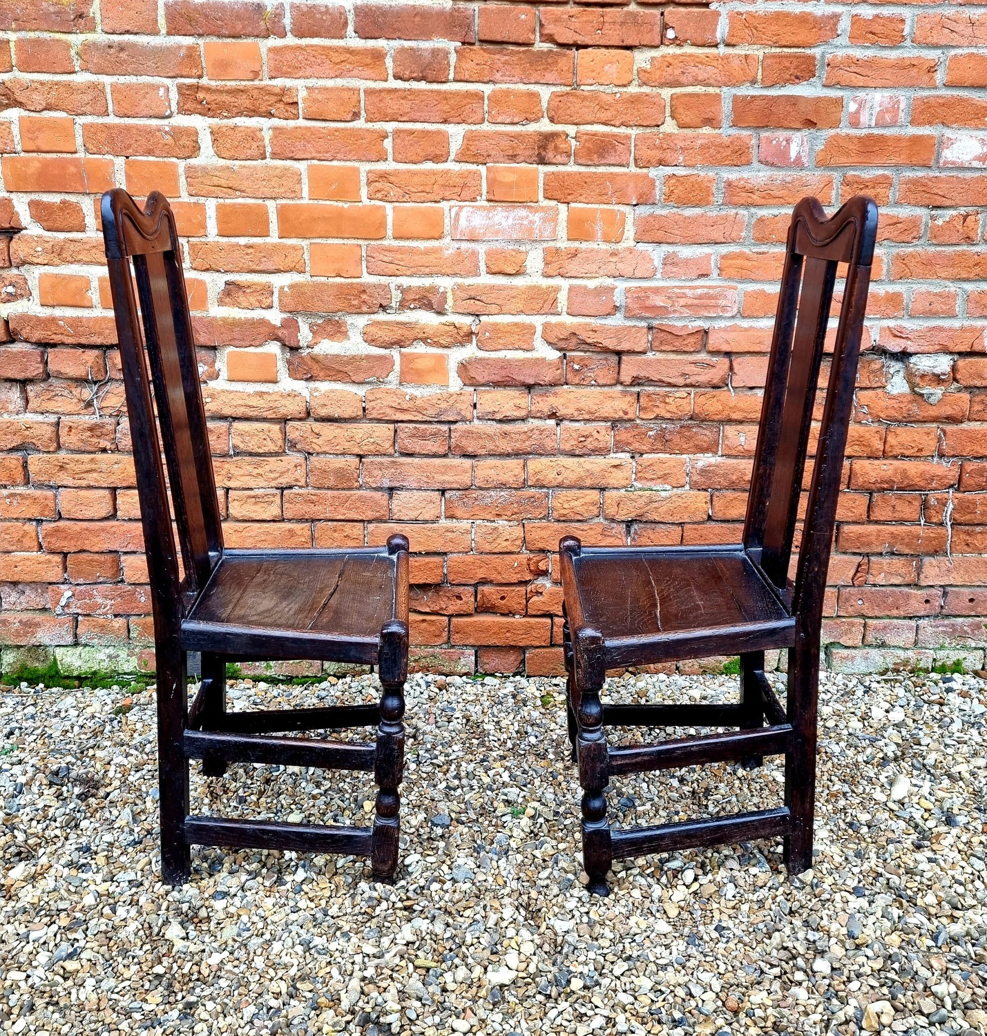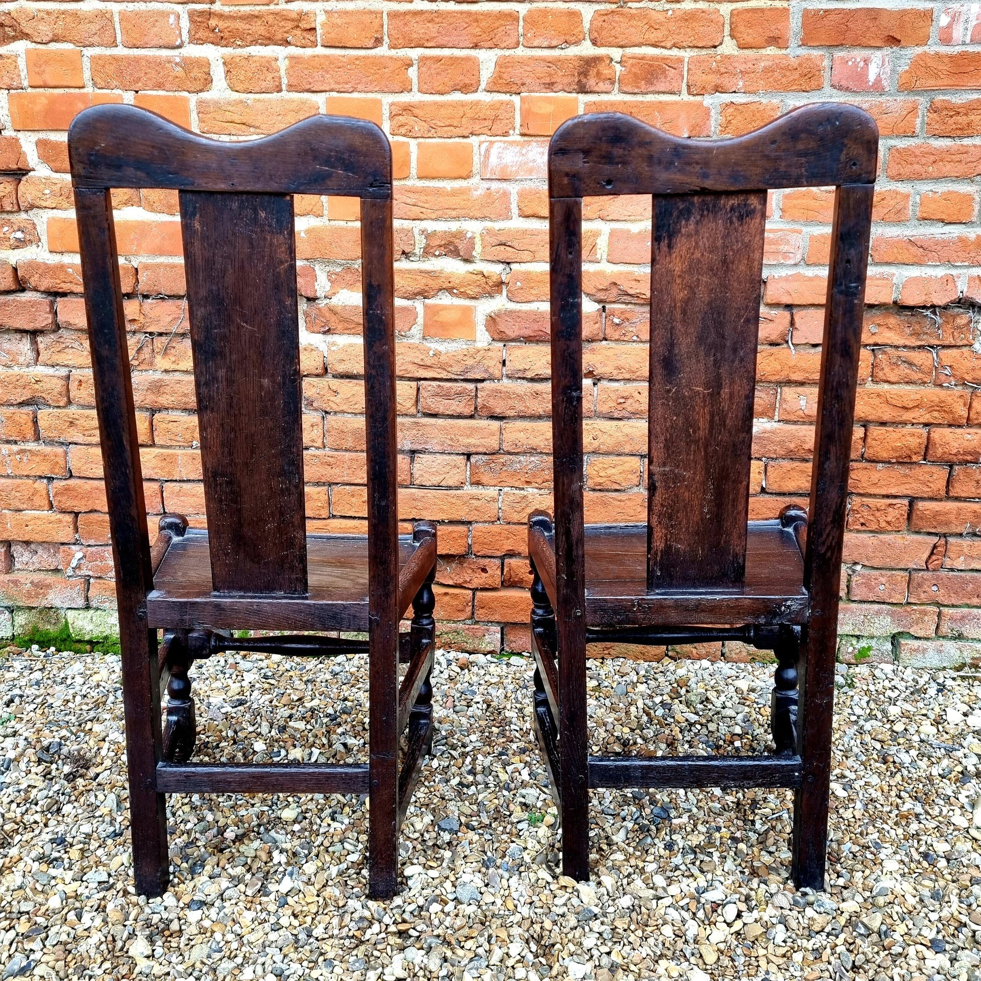 A fine pair of 17thC Welsh antique oak hall chairs or back stools sourced from a private Suffolk-based collection.