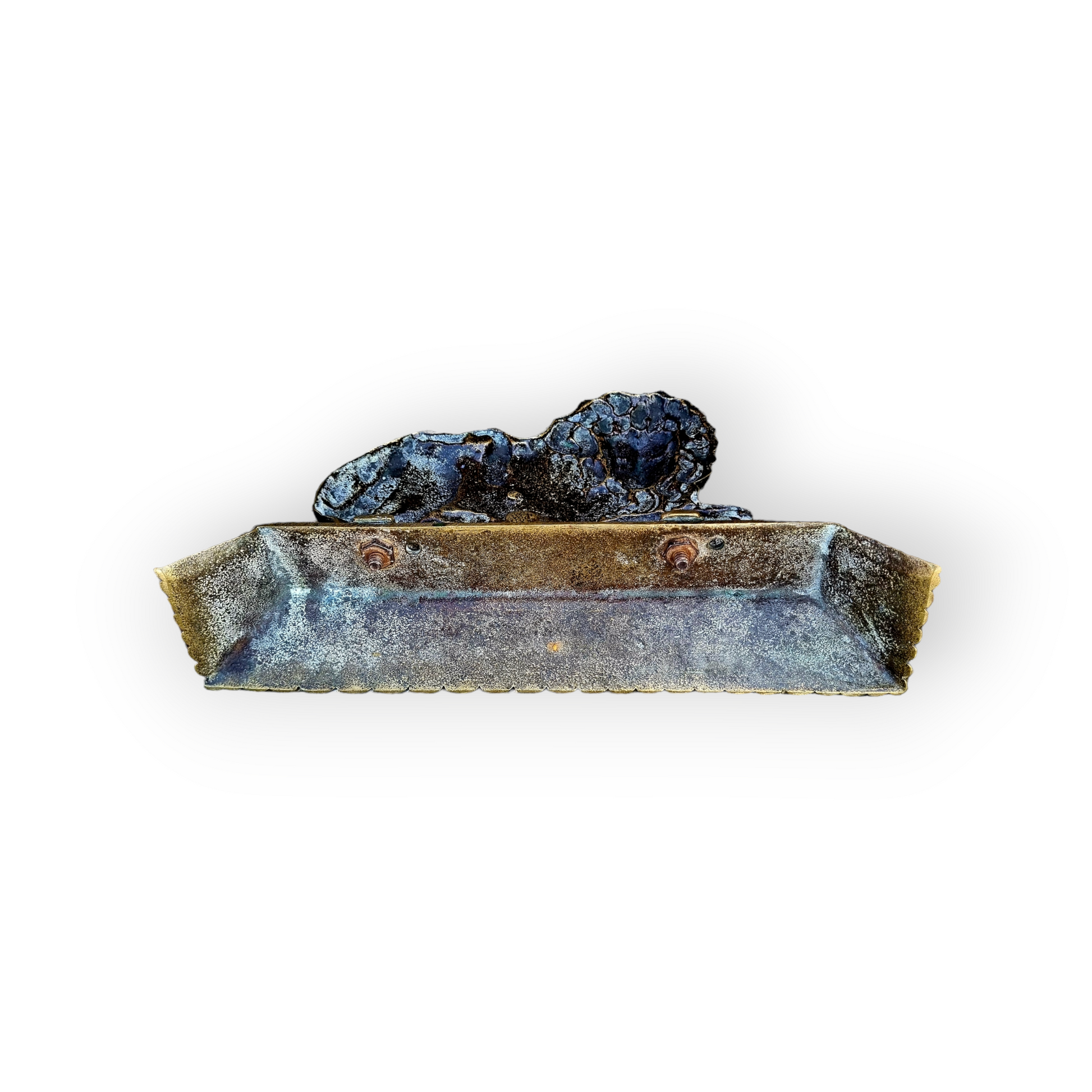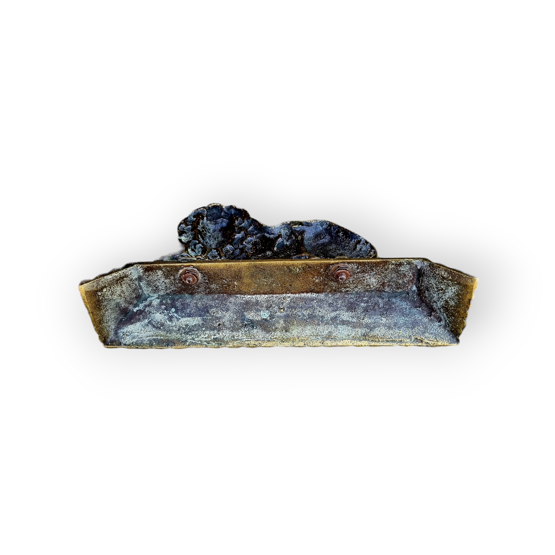 Each is portrayed in a recumbent position and presented on an elongated stepped base.