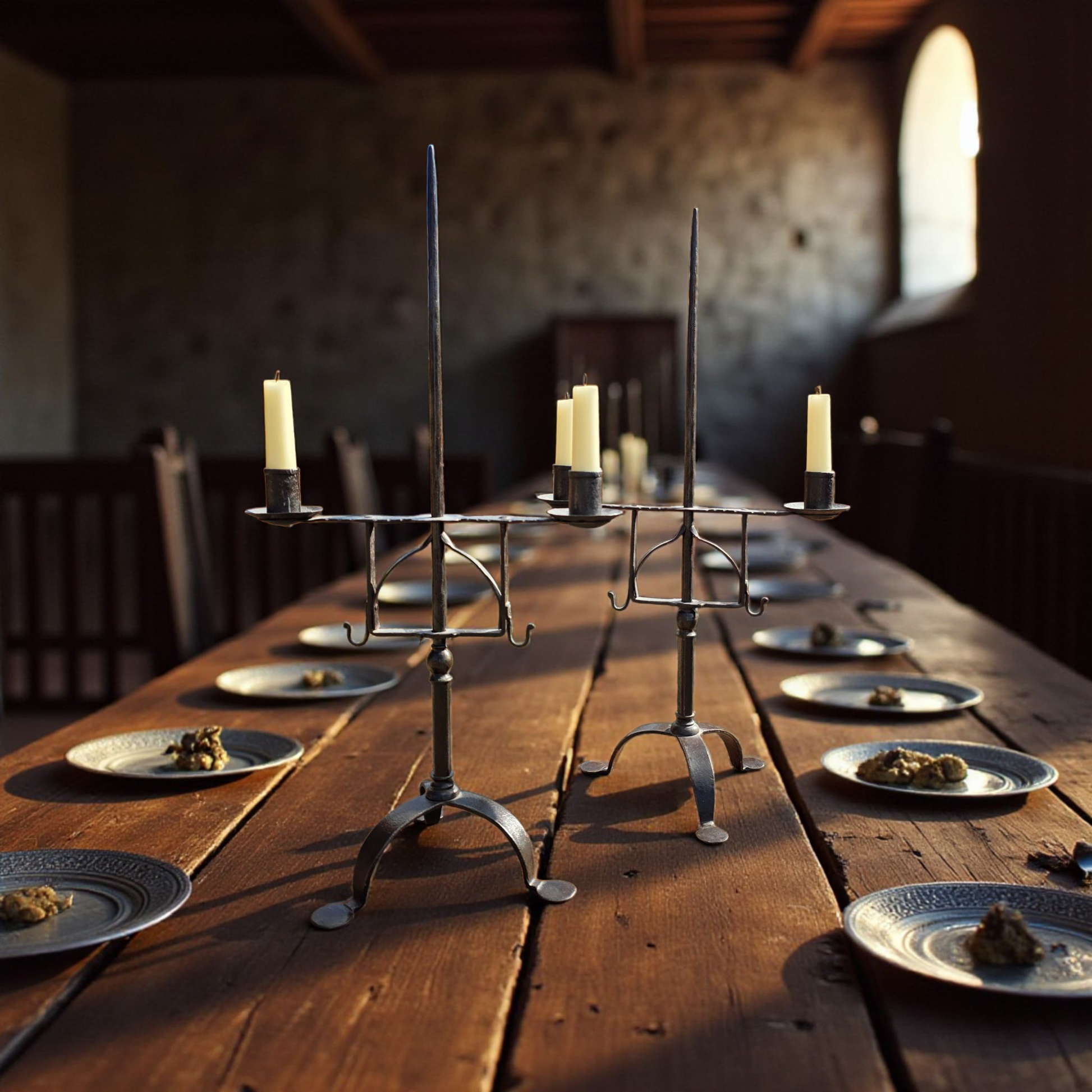 Adjustable Height: Each candelabra stands at 23 inches (58.5 cm) tall, with a sliding bracket held to the central shaft by way of a sprung mechanism, for variable candle height—ideal for ambient lighting or display.