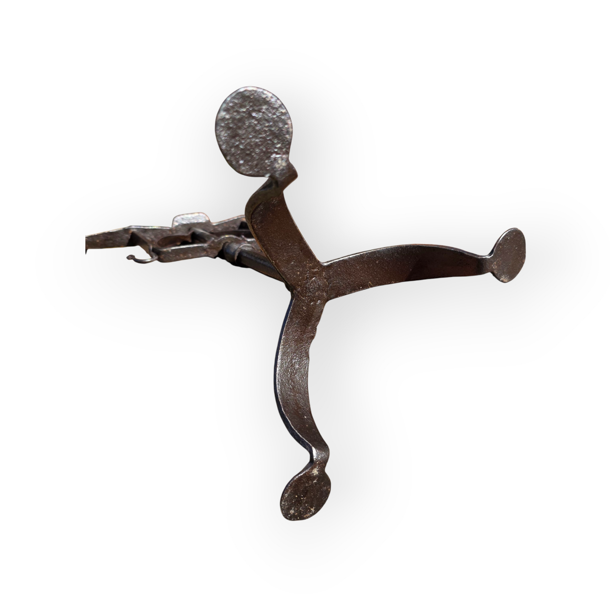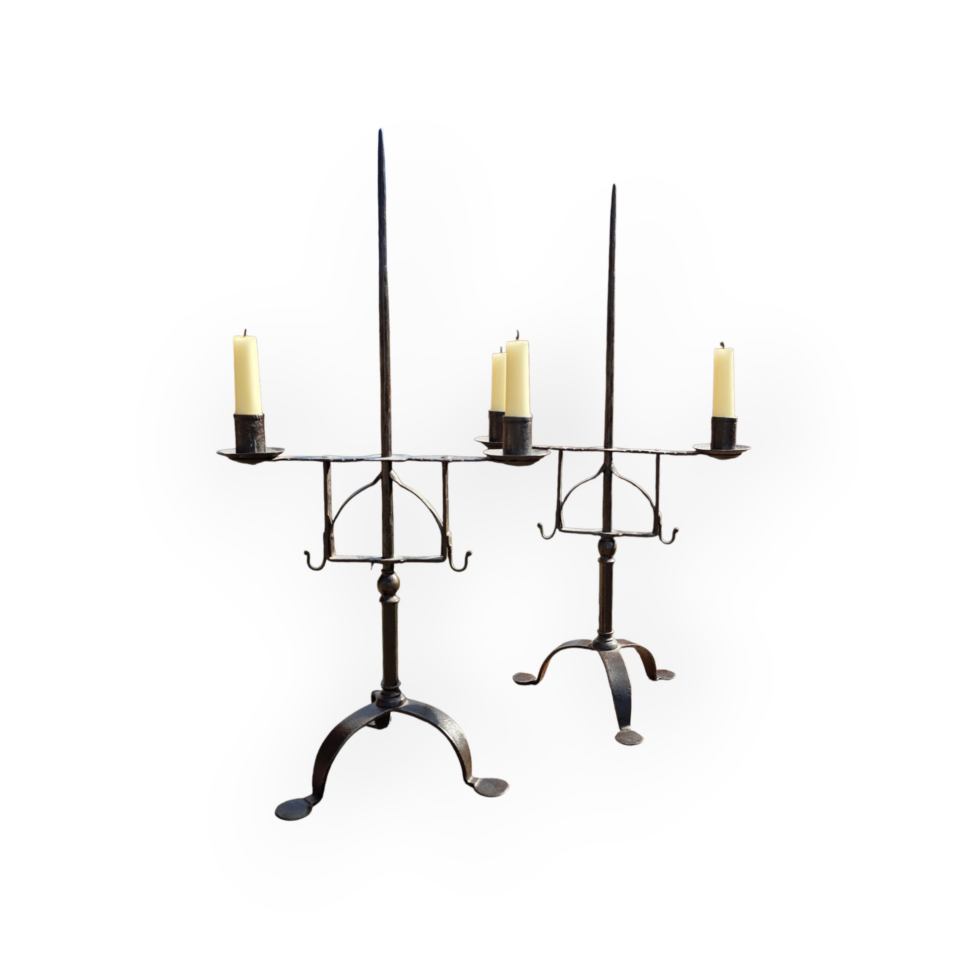 Tripod Base with Penny Feet: The sturdy tripod base terminates in distinctive “penny” feet, a hallmark of early English ironwork.