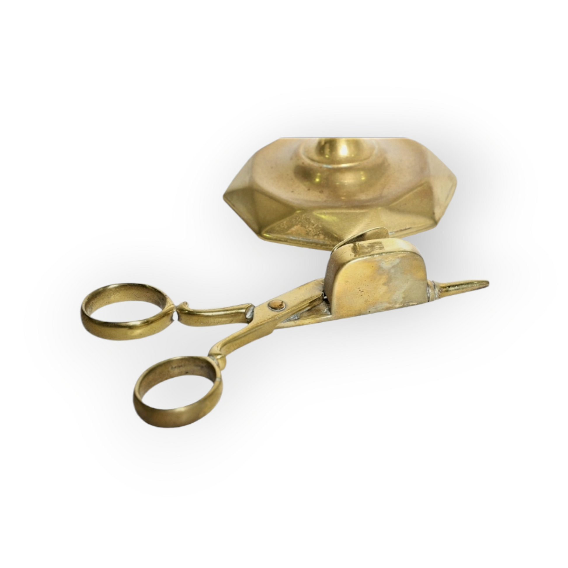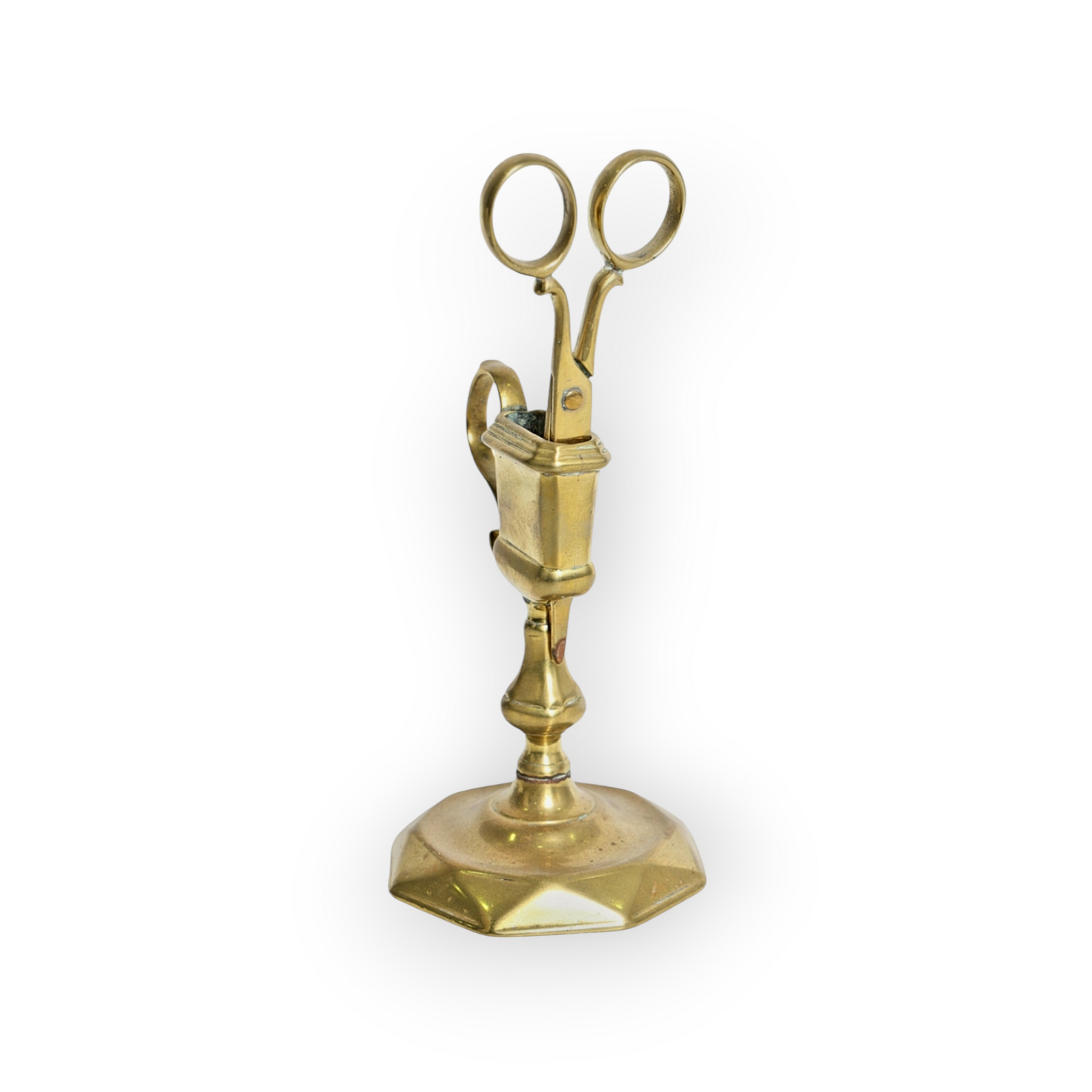 The snuffer, or wick-trimmer, is of scissor form. One blade is fitted with a plate, the other with a box and terminates in a point. The stand has a rectangular holder with a scrolled handle and is supported overall on a knoped stem with a raised octagonal foot.