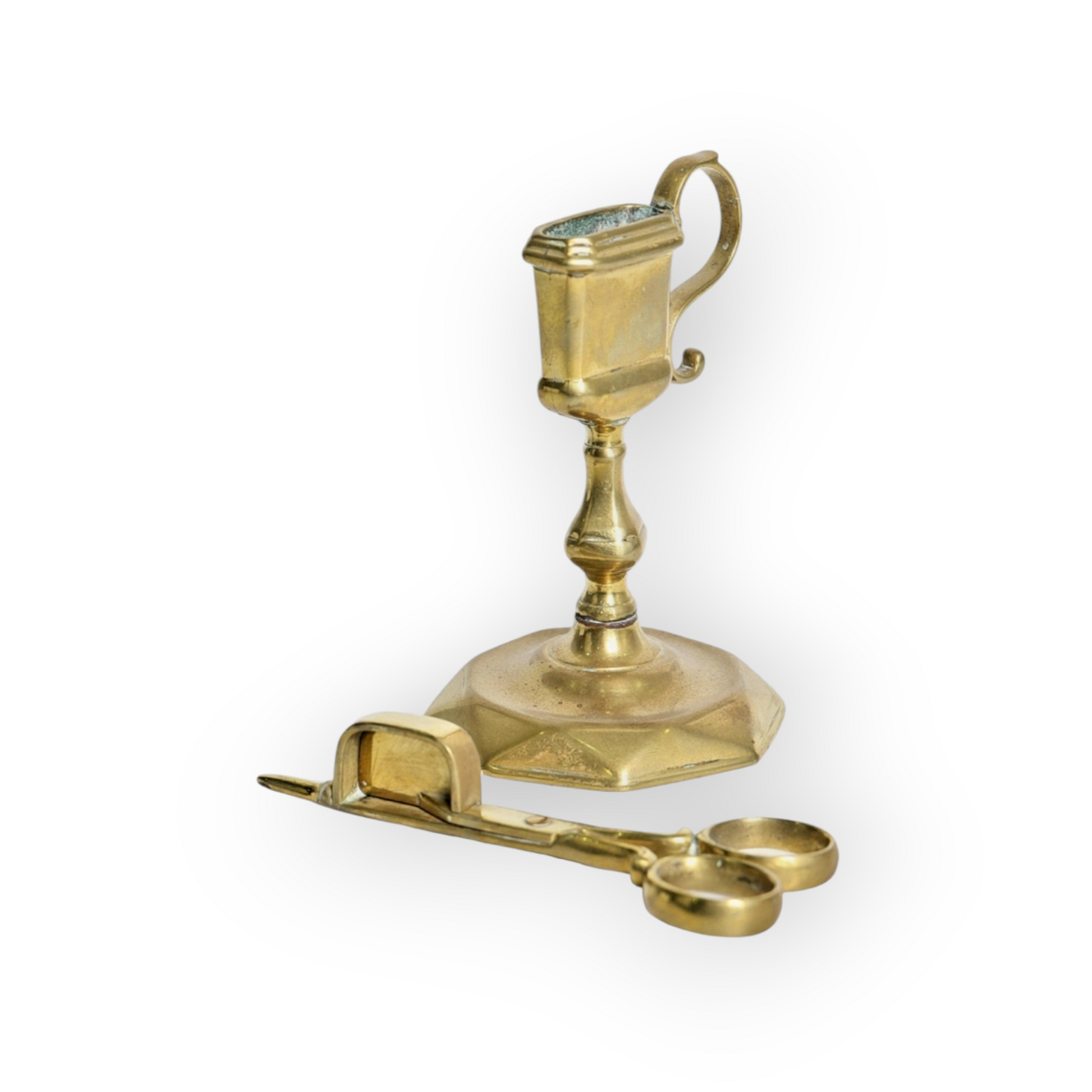 A rare early 18th-century English antique brass candle-snuffer with its original stand, circa 1720-40.