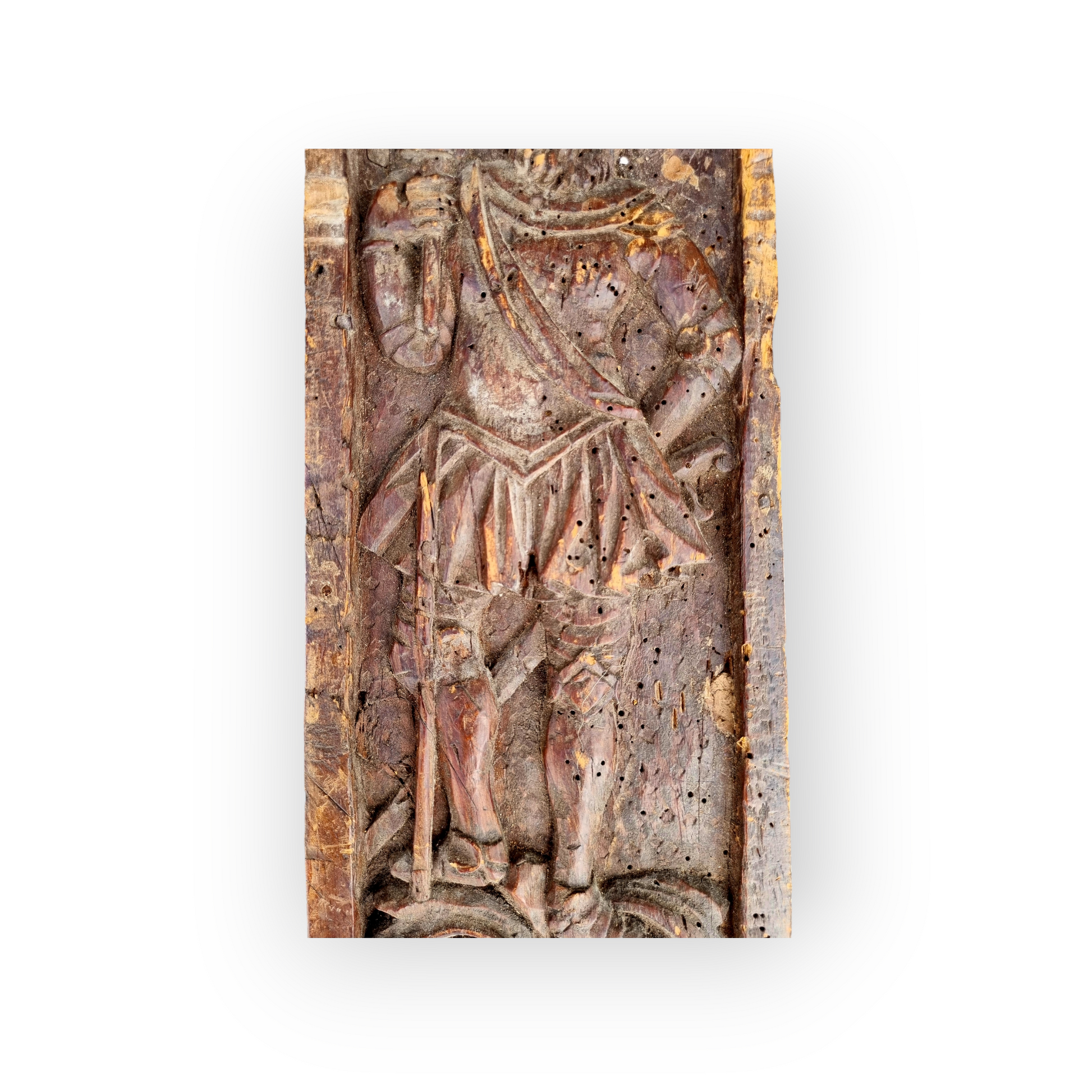 The second panel depicts a soldier standing full-length, holding a polearm (also known as a "pertuisane") in his right hand. Below, his feet rest upon scrollwork, some which incorporates foliage.