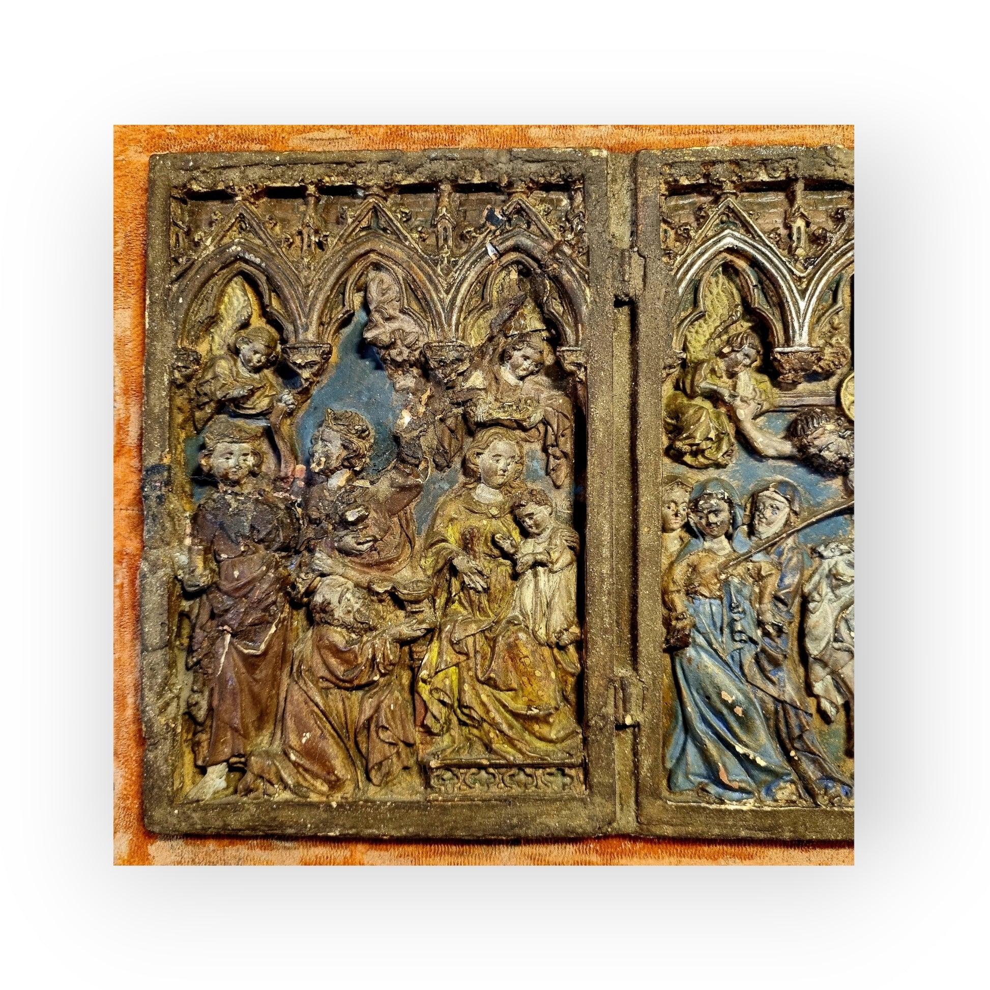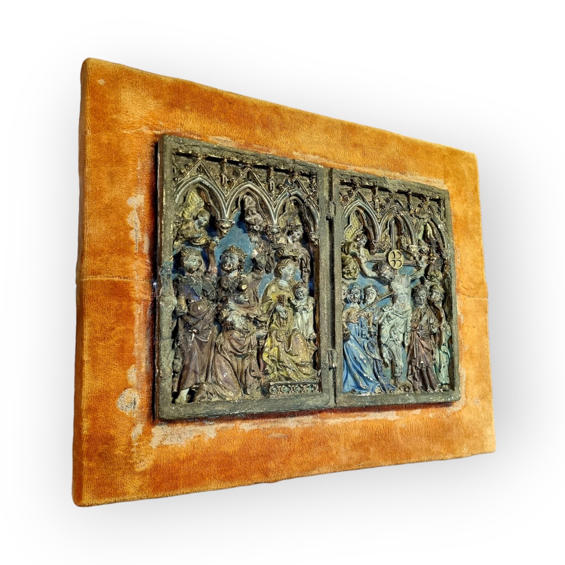 A rare and evocative Gothic polychrome plaster plaque, richly detailed and steeped in devotional symbolism. This Continental piece depicts two sacred scenes: the Adoration of the Magi and the Crucifixion, rendered in high relief with ochre, crimson, and cobalt pigments. The figures are stylised in Gothic tradition, framed by architectural motifs that echo ecclesiastical tracery.