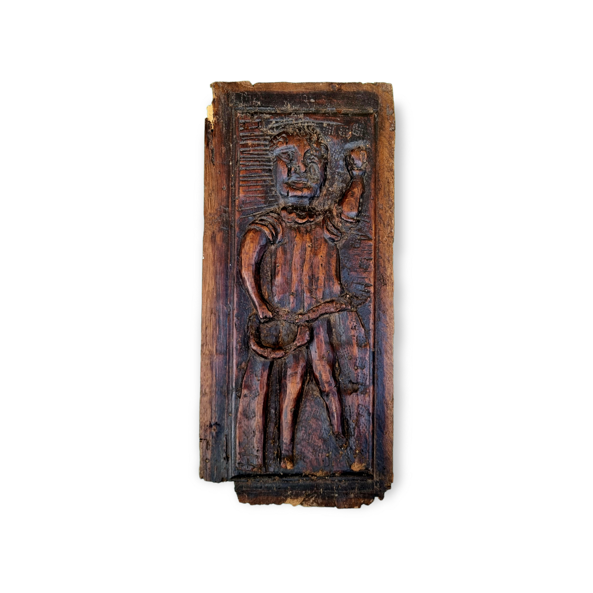 A rare survival of late Renaissance folk carving — ideal for collectors of figural sculpture, decorative fragments, or antique oak panels with vernacular charm.