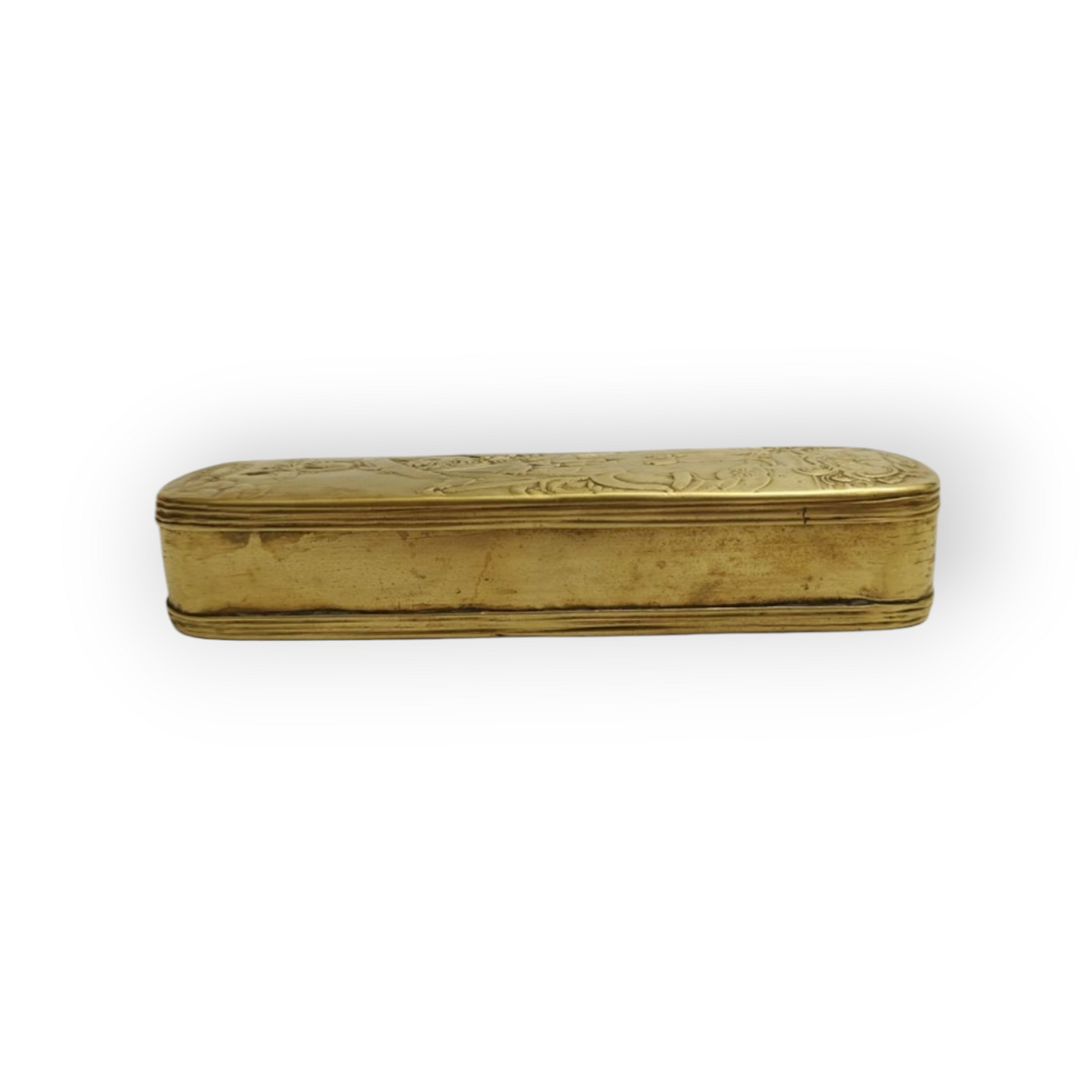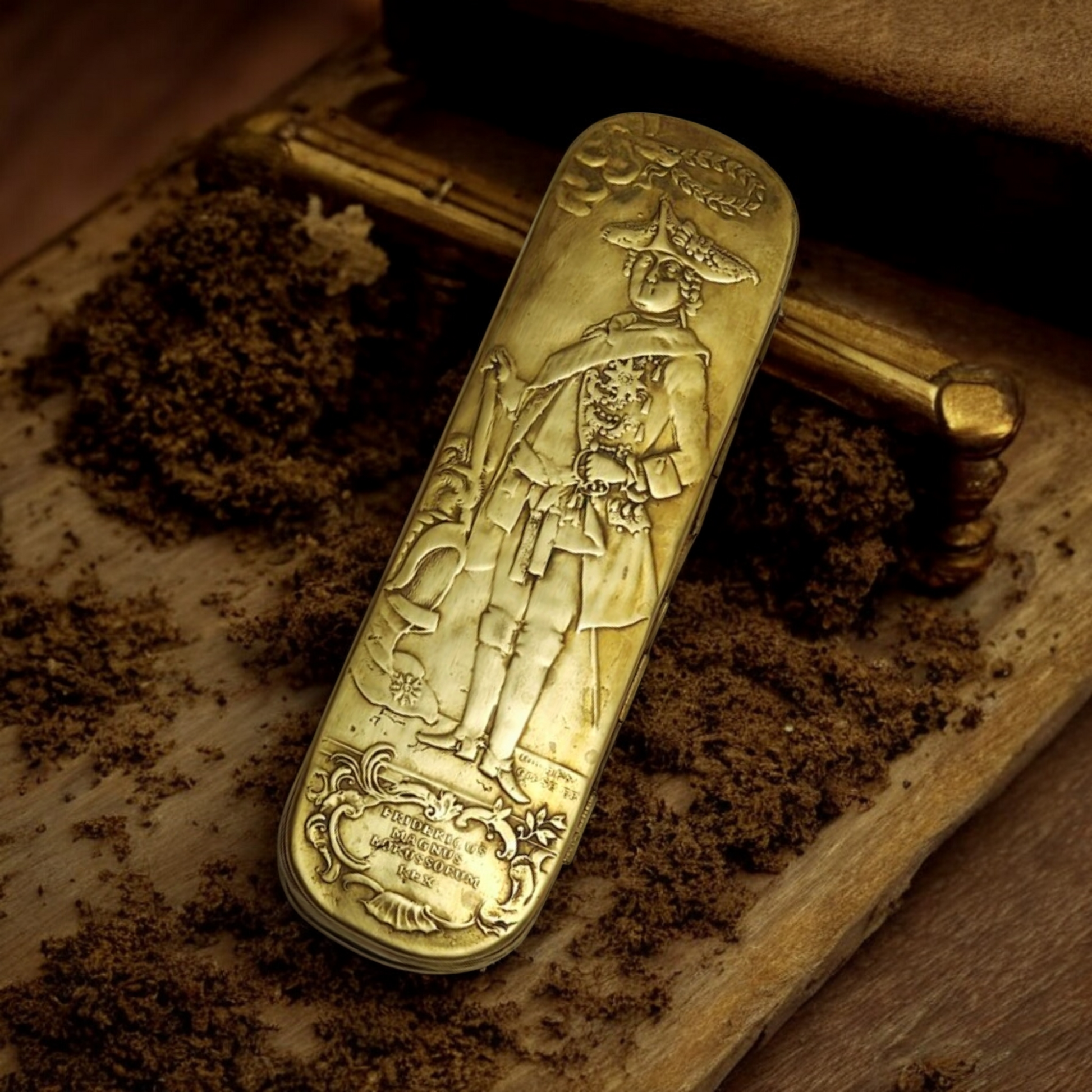 An 18th-century antique brass snuffbox commemorating Frederick II and his military victories during the Seven Years' War (1756-1763).