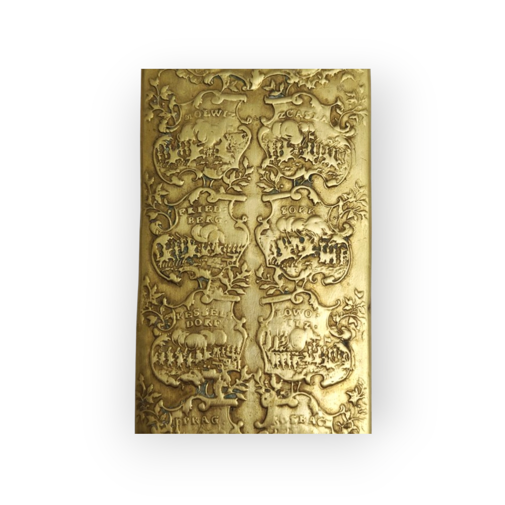 This box is a masterpiece of craftsmanship, decorated with a detailed embossed relief of the Monarch himself (he was also known as Frederick the Great) and verso, battle scenes depict his military triumphs with Latin inscriptions.