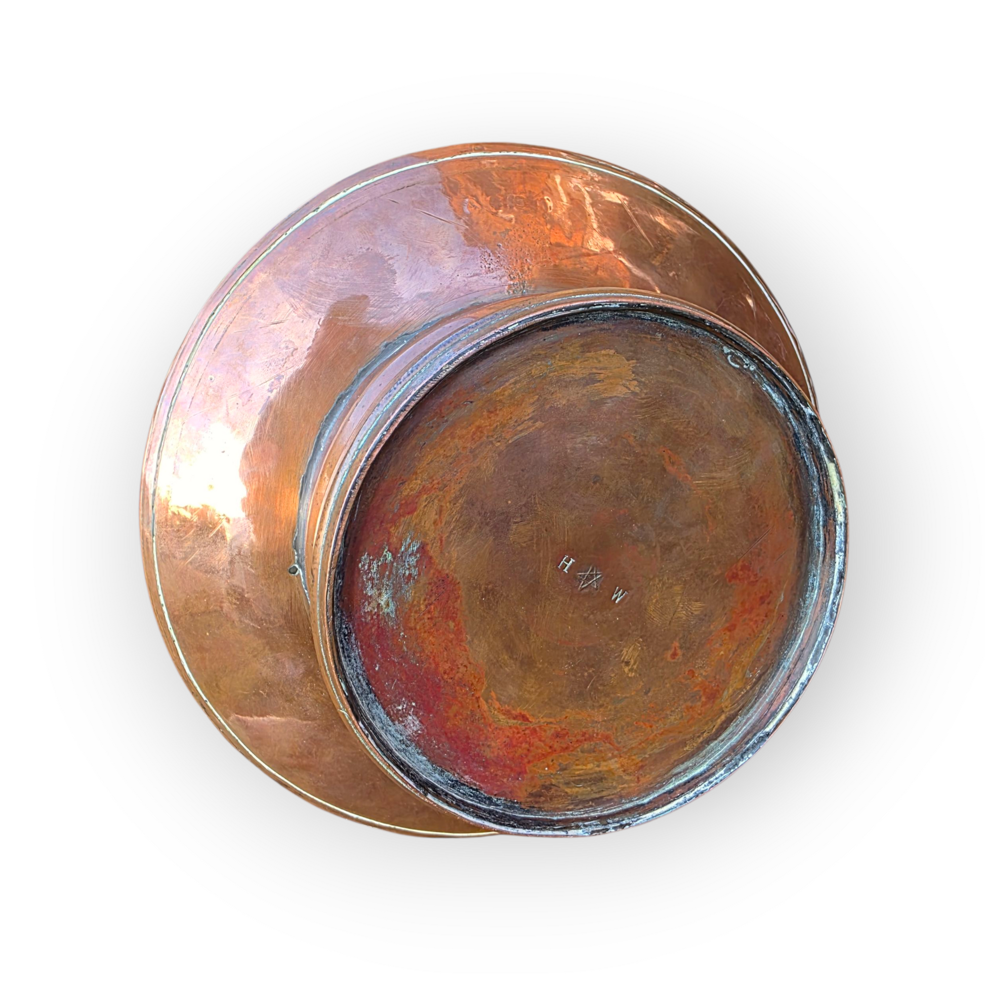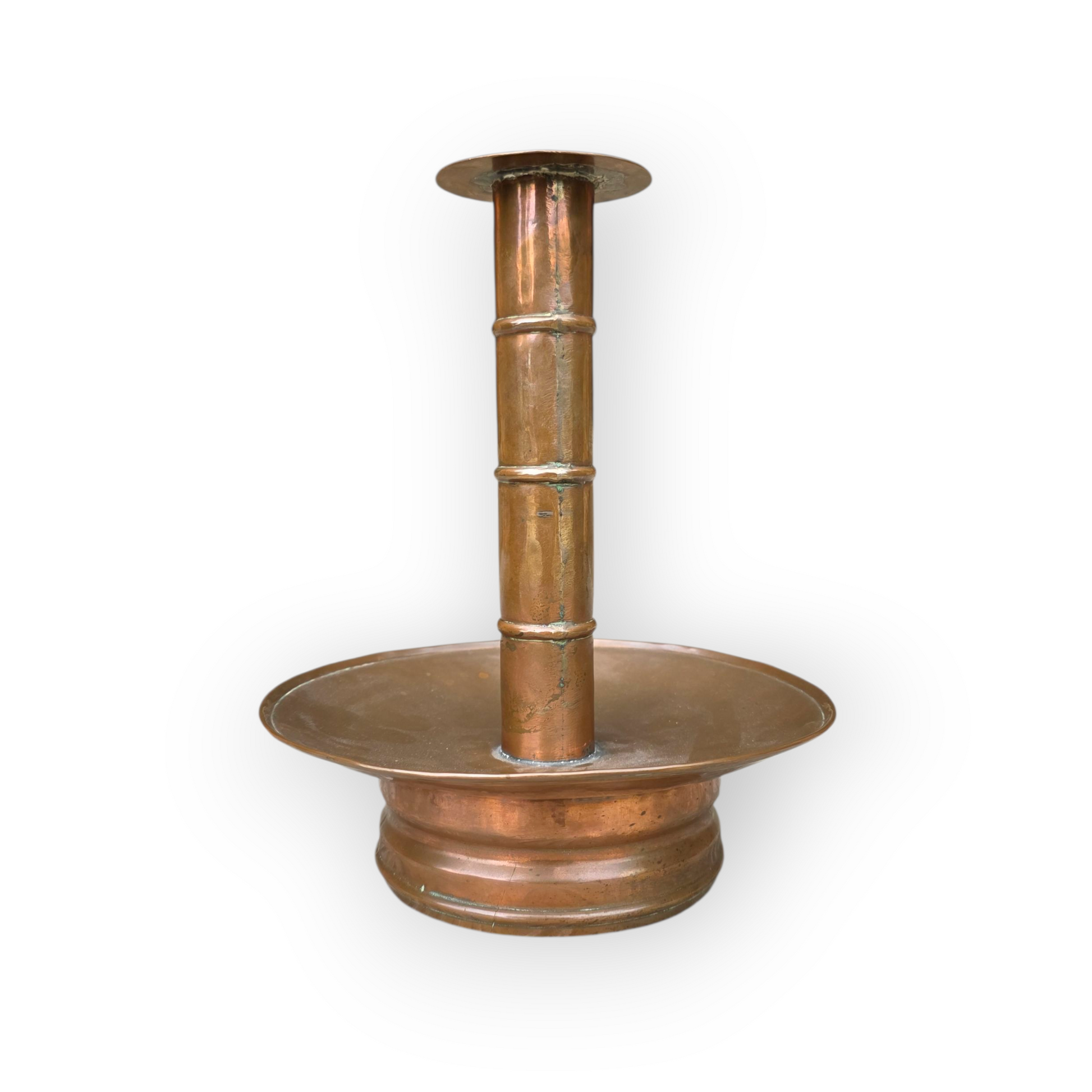 An exceptional and uncommon survival from 19th-century England, this integrated copper tinder box and candlestick combines utility with regional heritage. Crafted in substantial gauge copper, the piece features a broad cylindrical base housing the original tinder compartment, surmounted by a fixed candlestick socket.