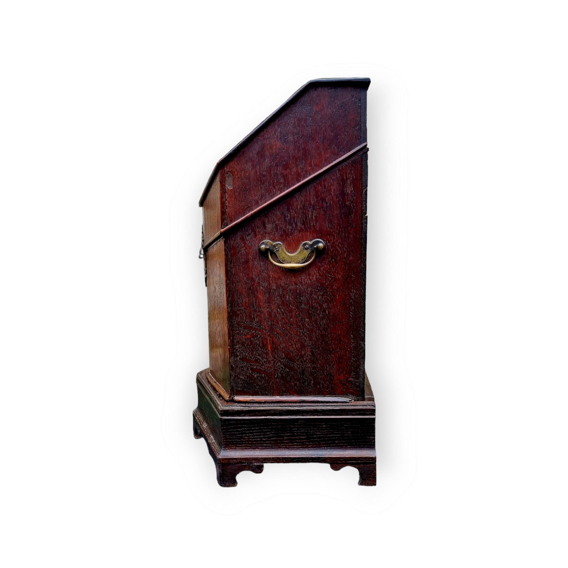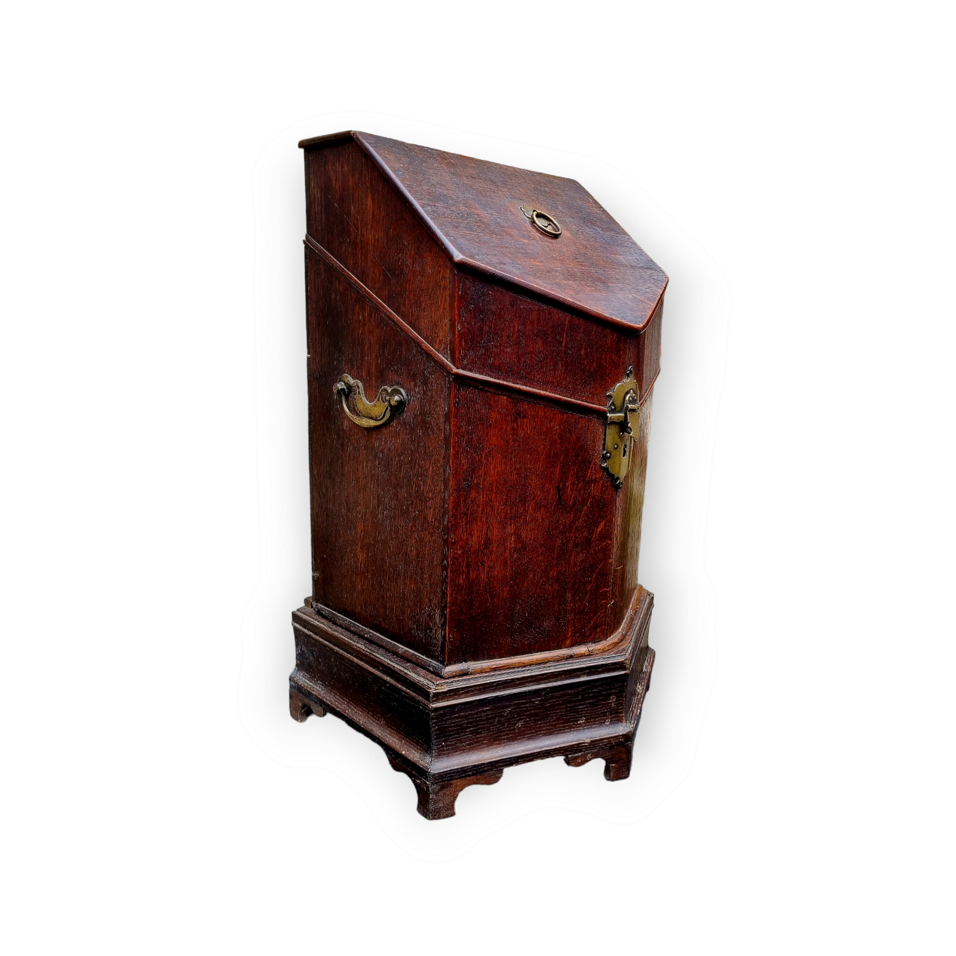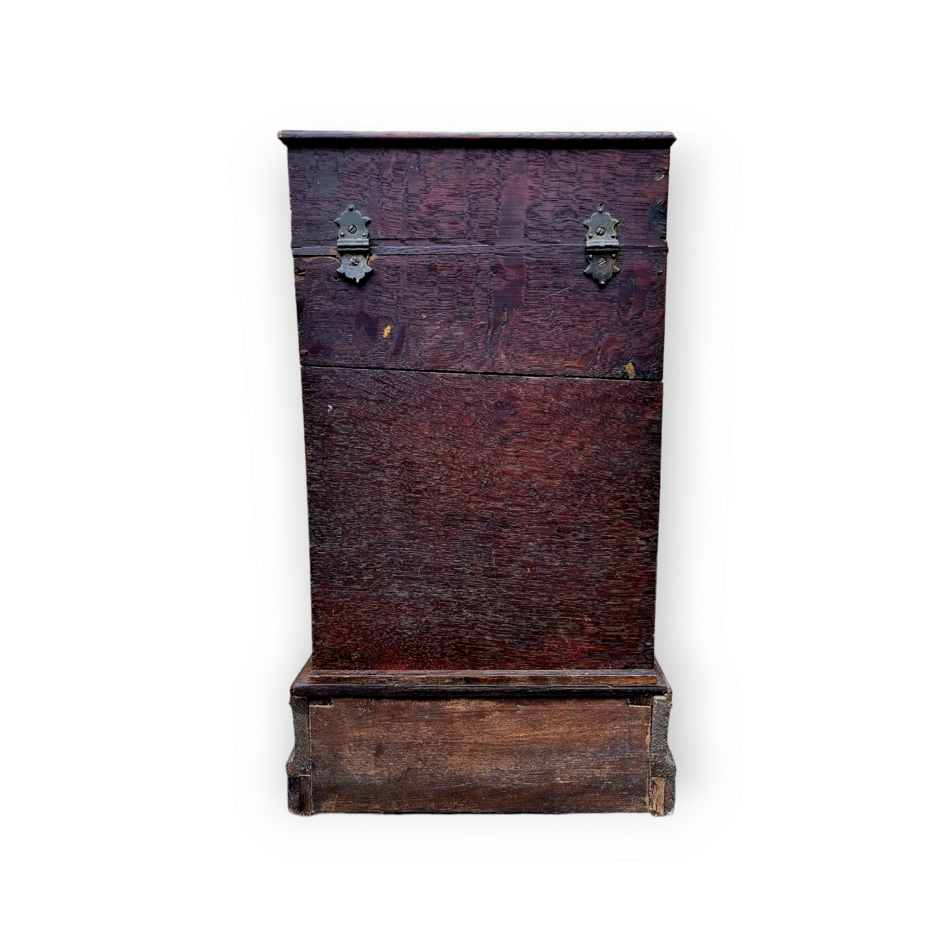 This example (please note that this is a single box and not a pair) is constructed from oak. A rarity. More so, the box is supported on an associated, detachable, pentagonal plinth base with raised bracket feet.