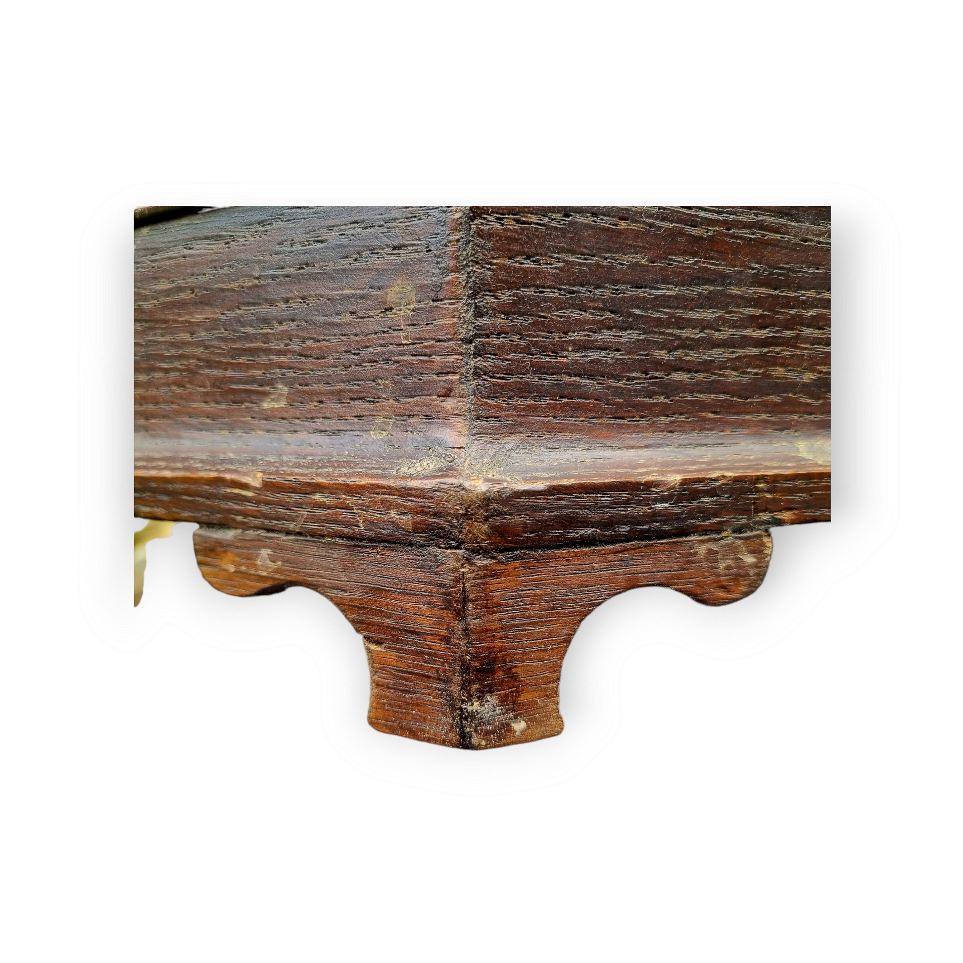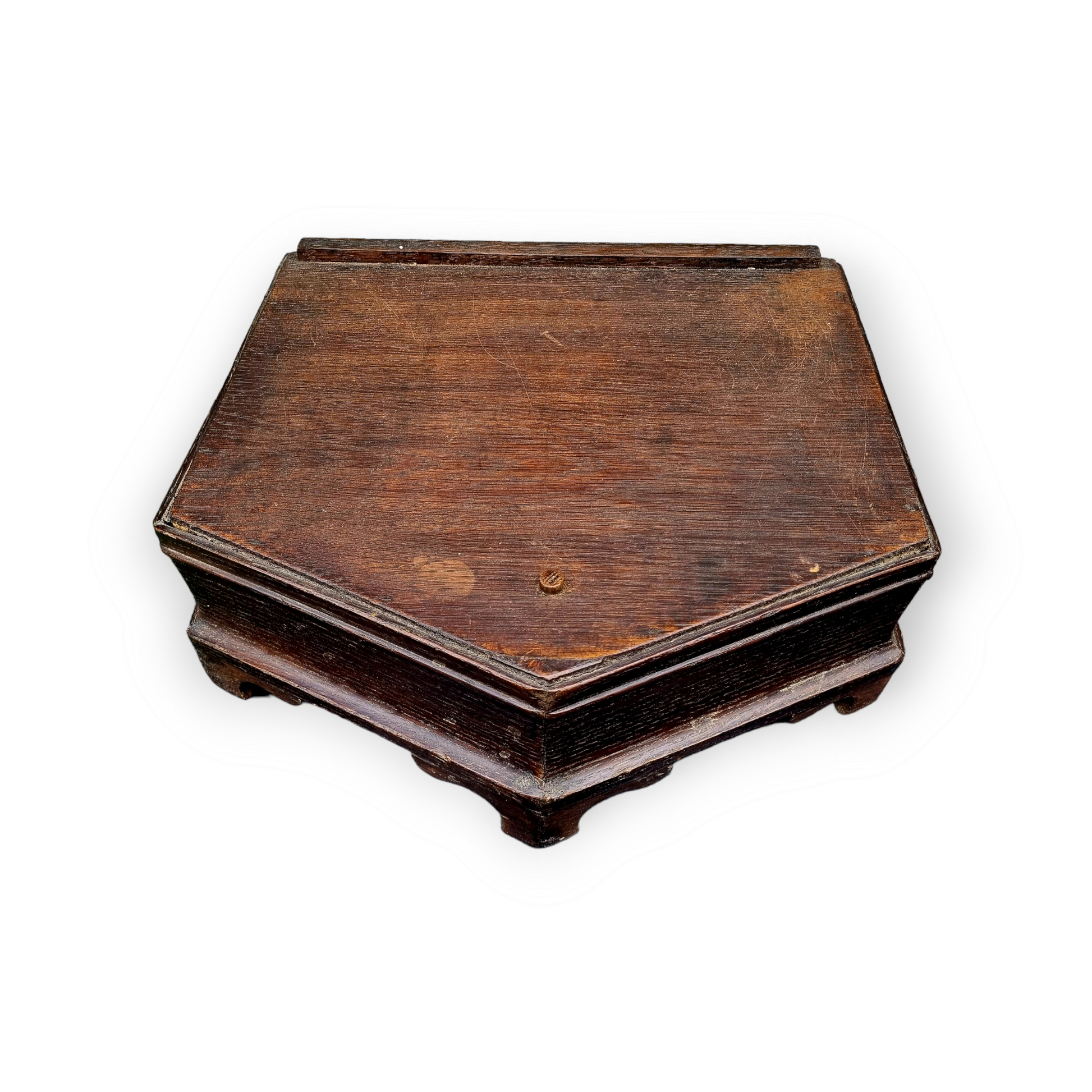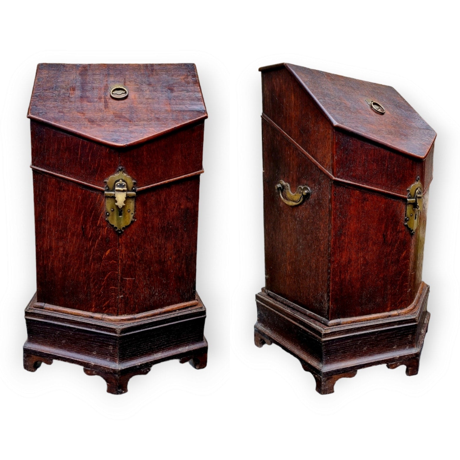 This example (please note that this is a single box and not a pair) is constructed from oak. A rarity. More so, the box is supported on an associated, detachable, pentagonal plinth base with raised bracket feet.