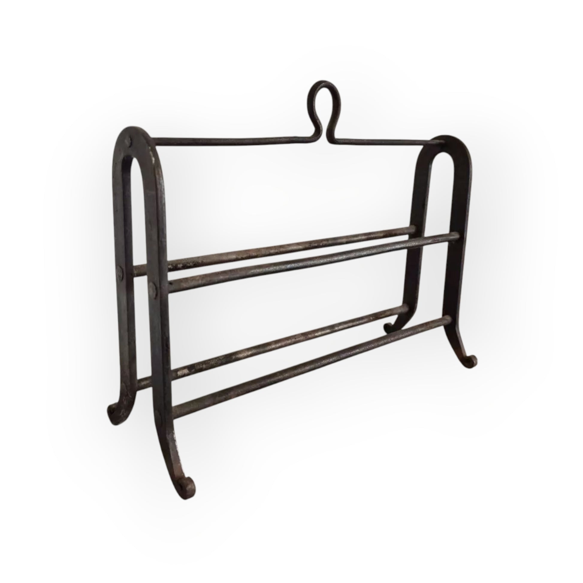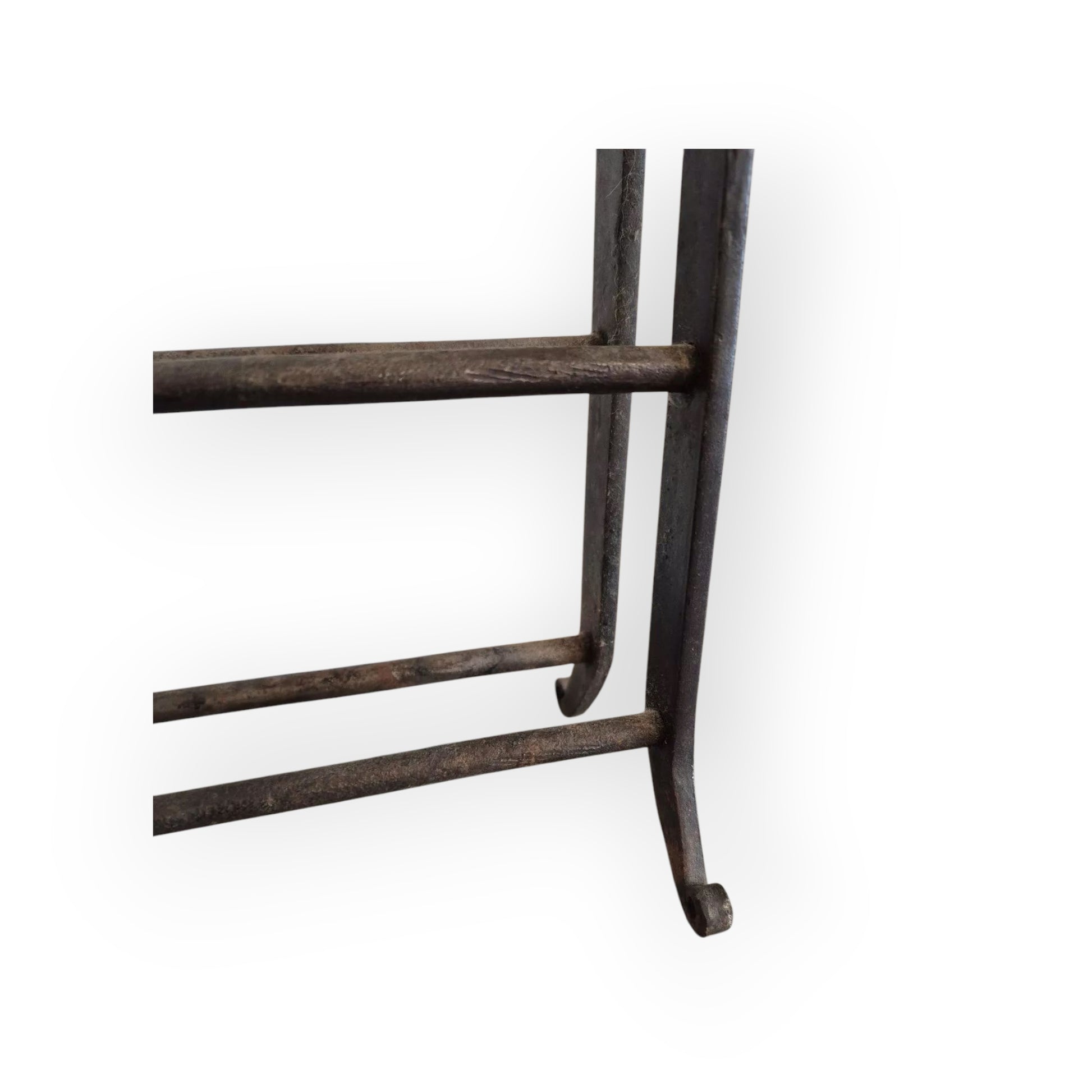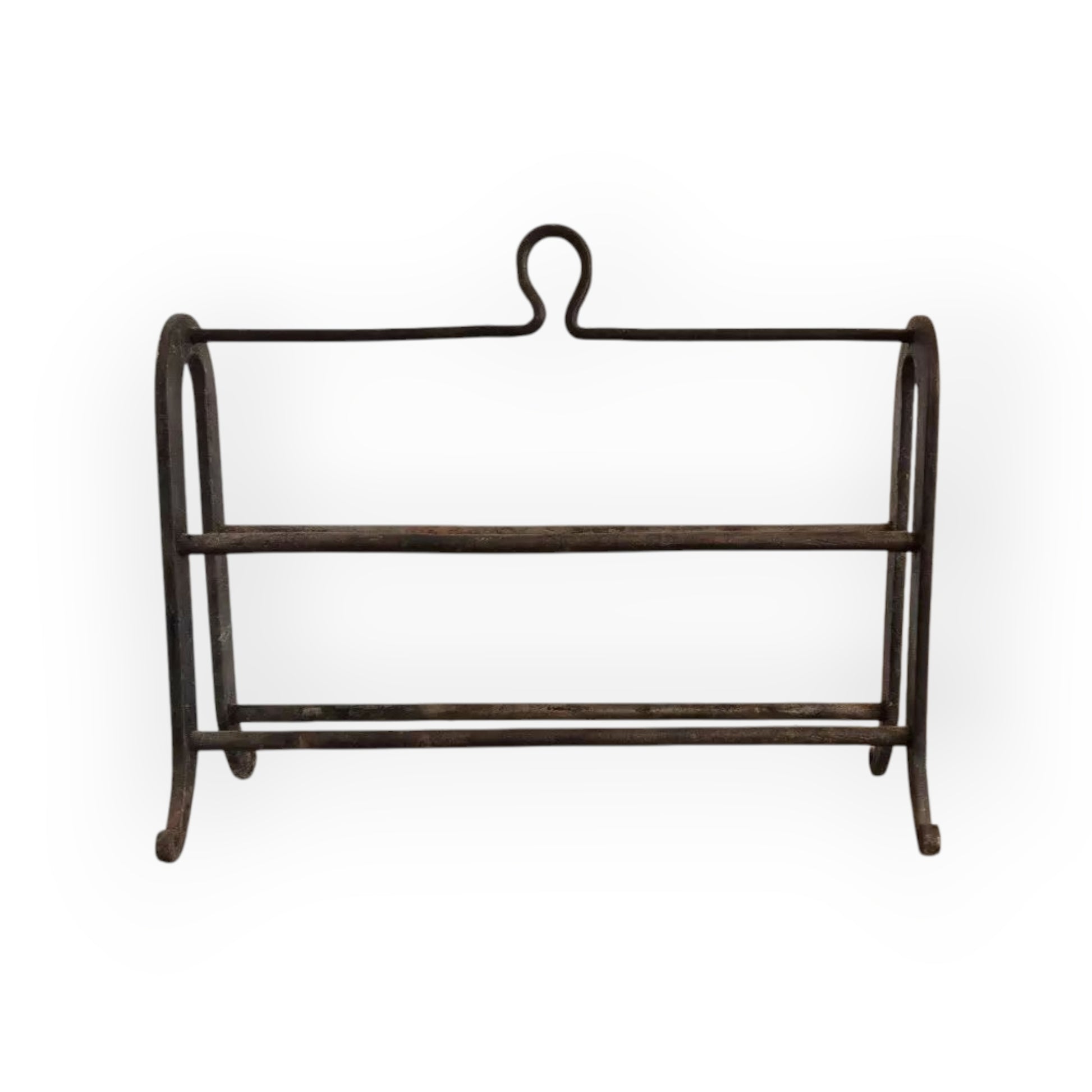 With a shaped carry handle over two shelves made from iron rods, supported on shaped ends with splayed feet.