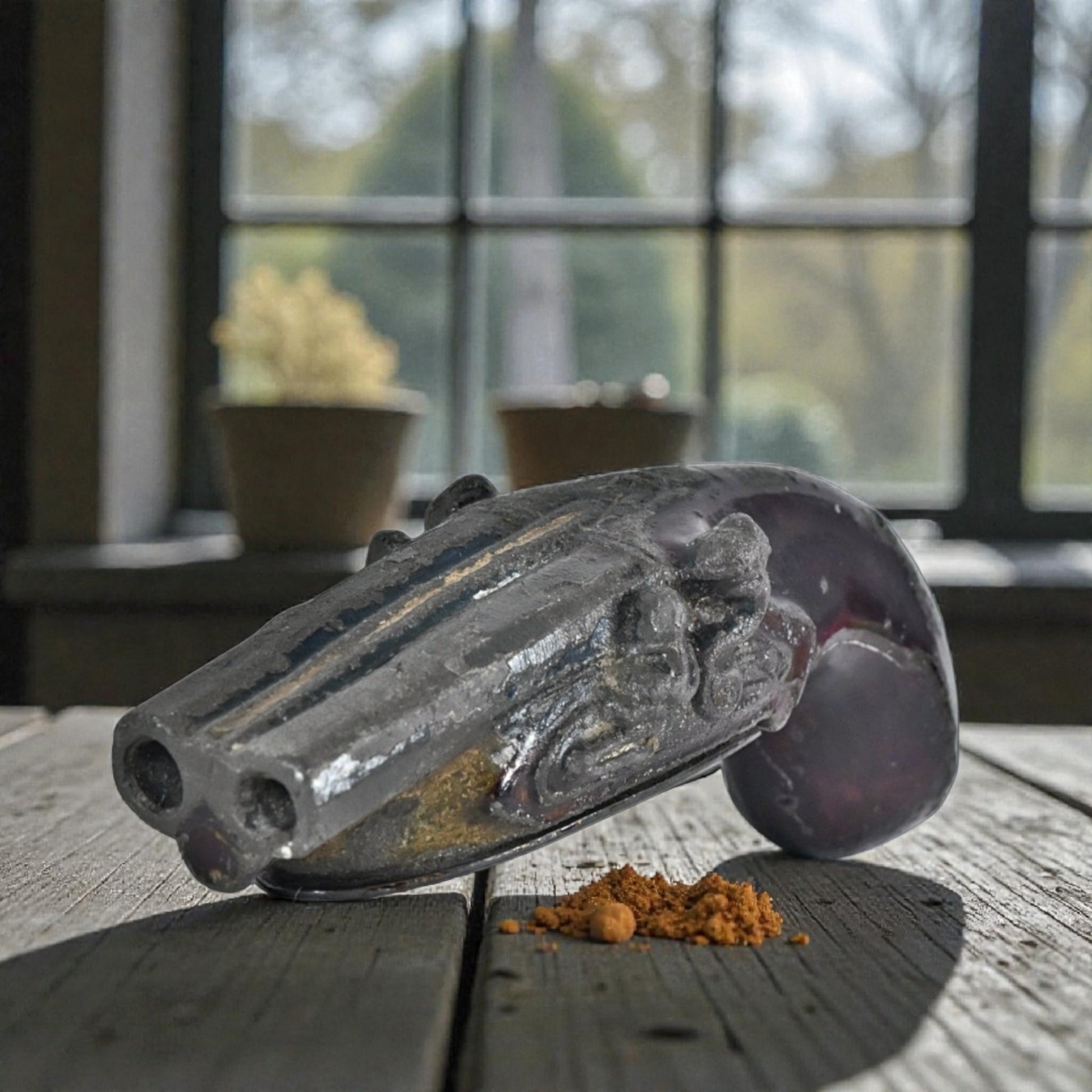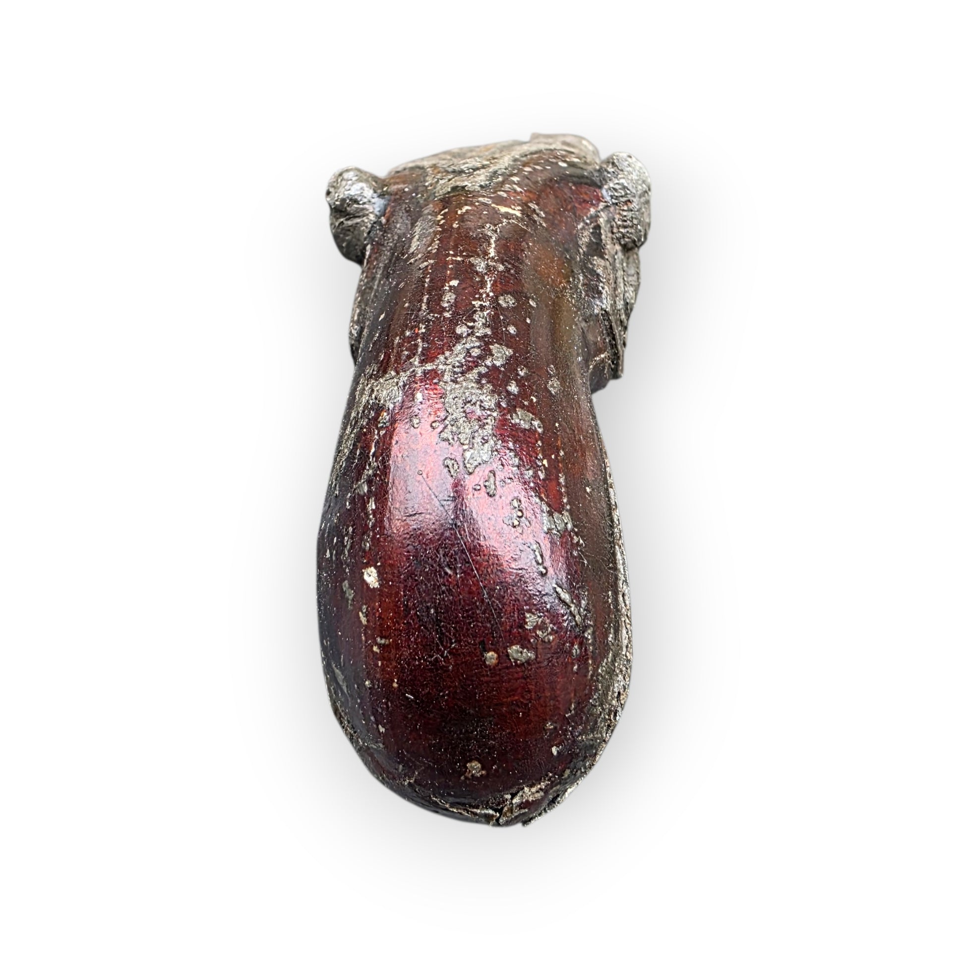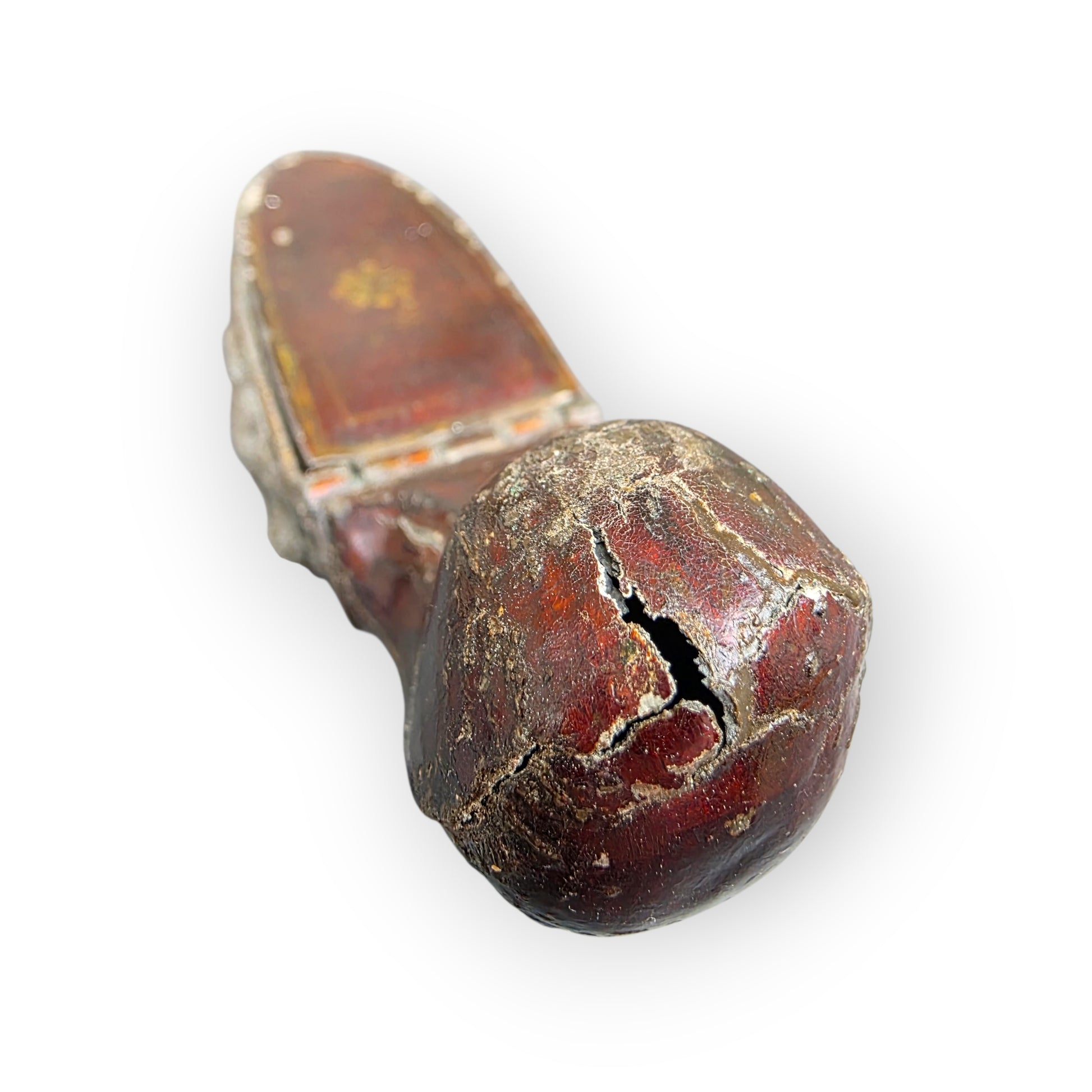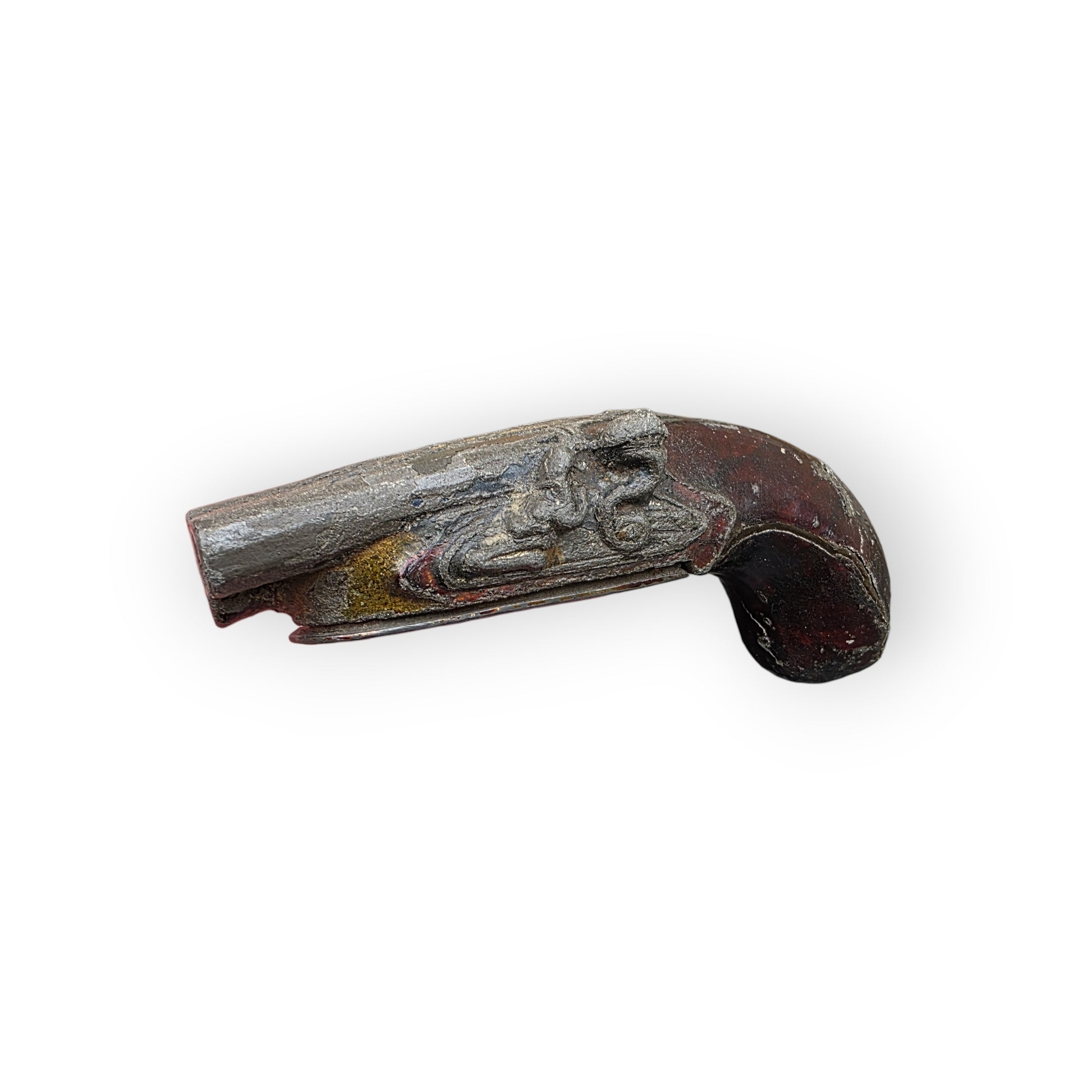 The form is crisply moulded, with the twin barrels, hammers and stock all clearly defined. The opening for the snuff box is where the trigger would have been positioned. The surviving paintwork is particularly appealing, offering a glimpse into the object’s original vibrancy. These novelty snuff boxes were produced in small numbers and are now increasingly scarce, especially in such honest, untouched condition.
