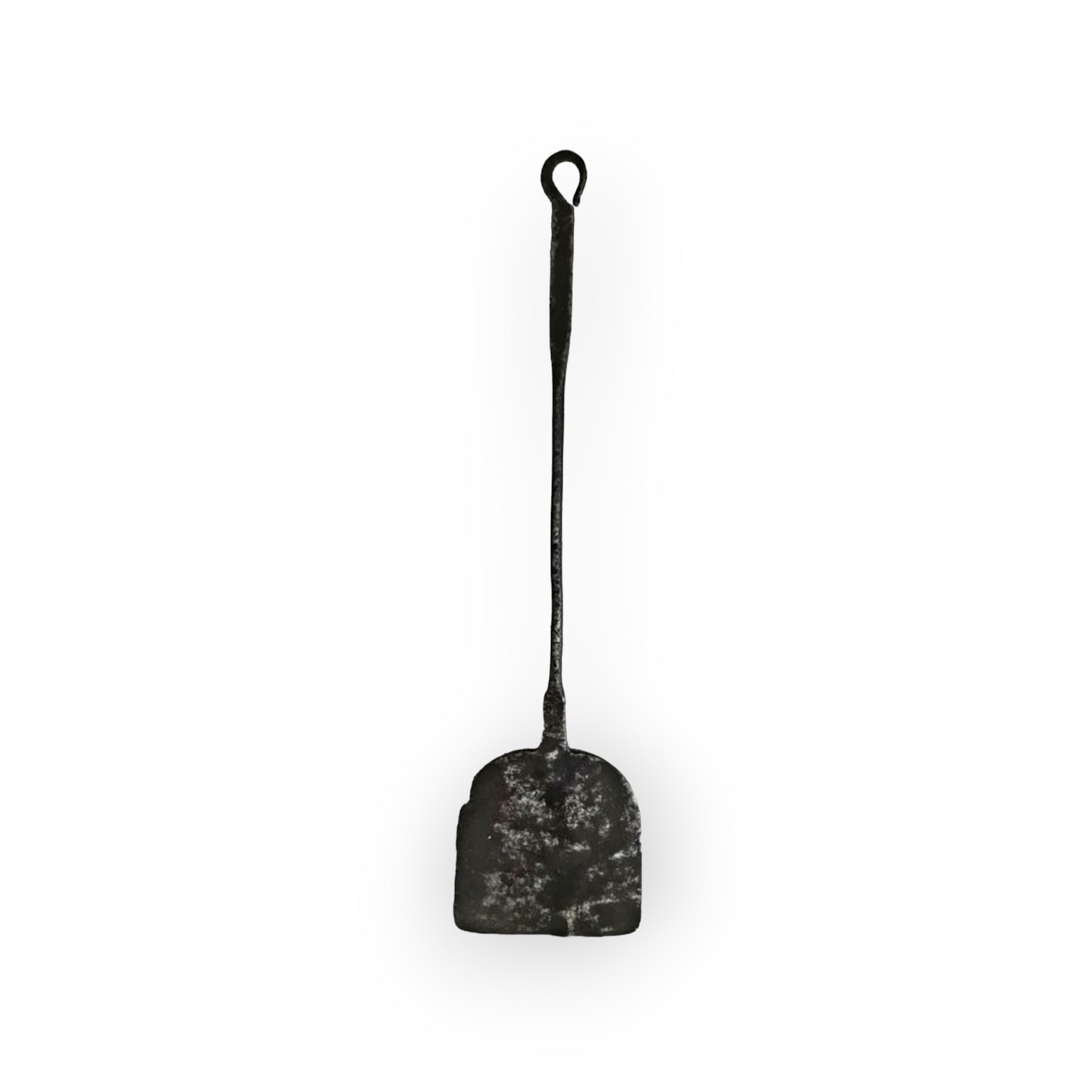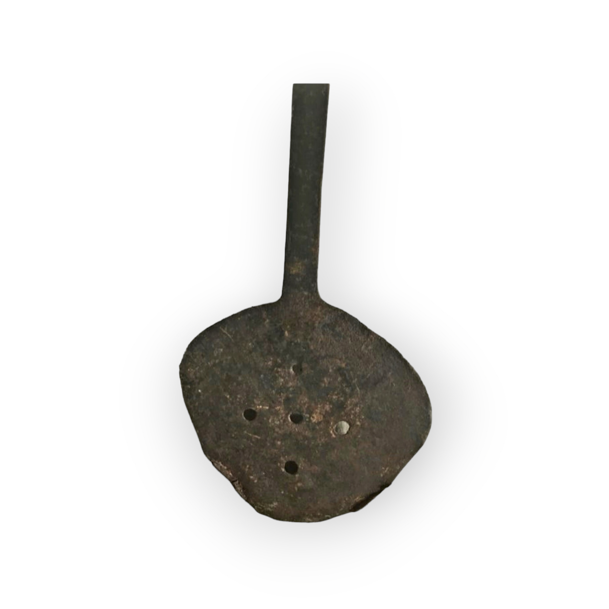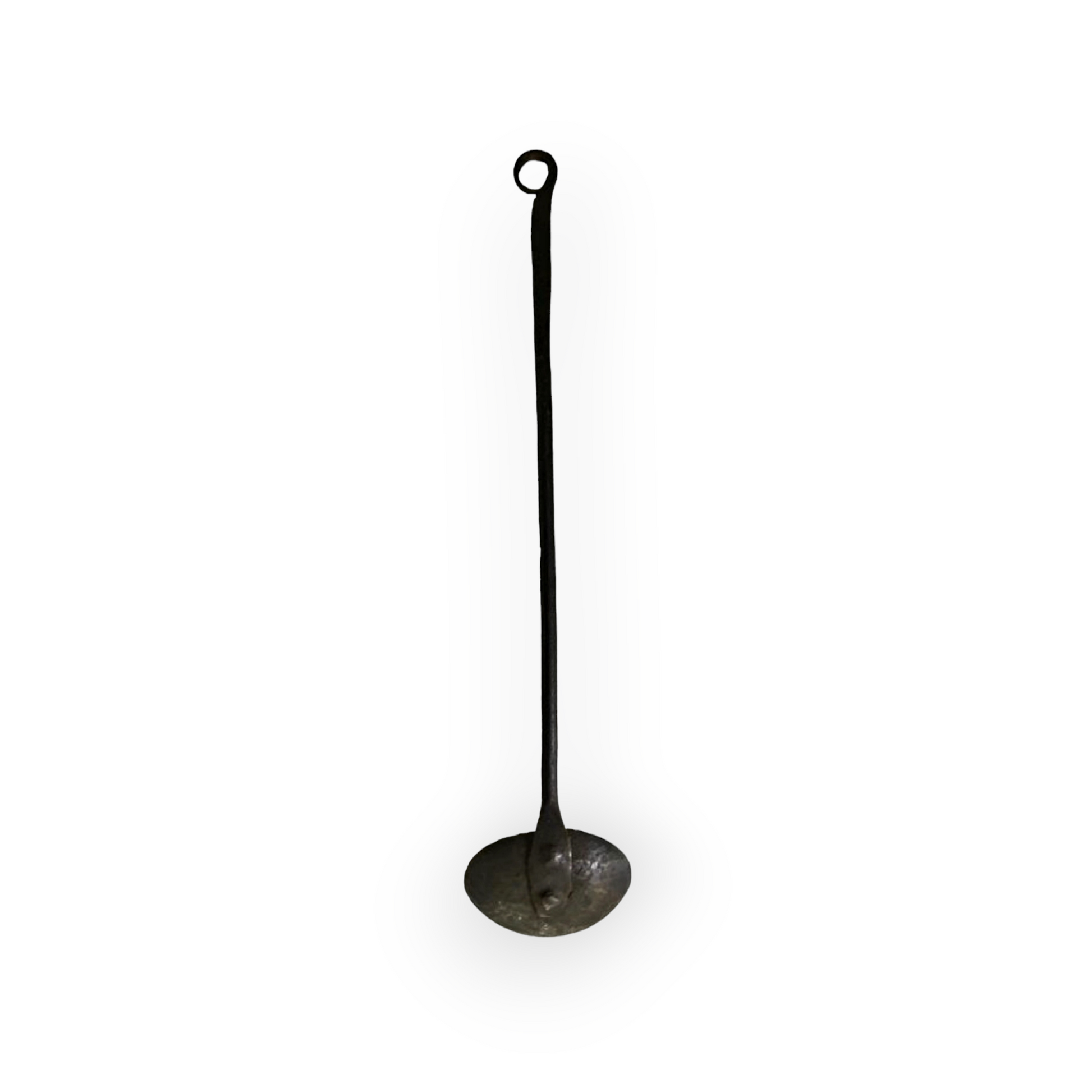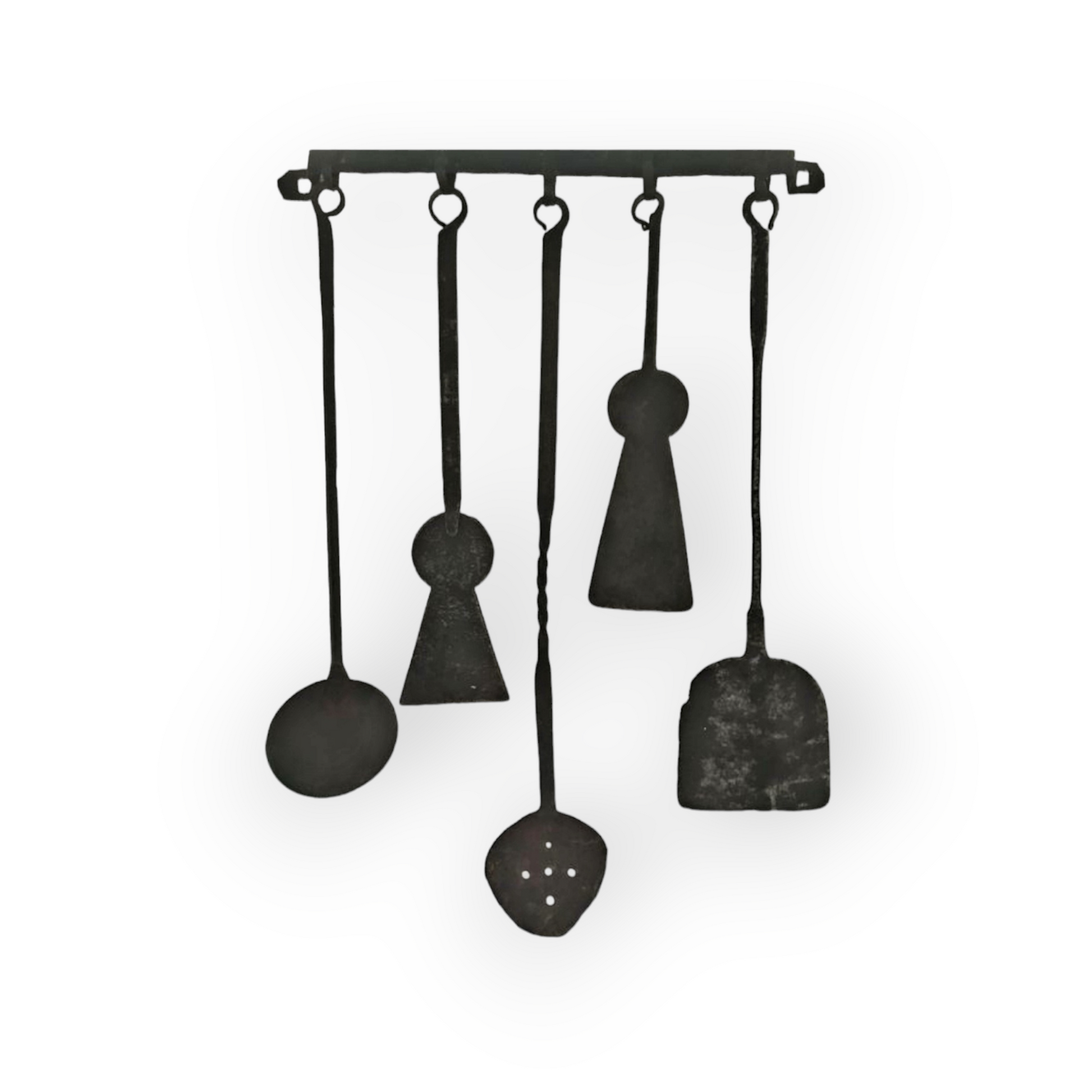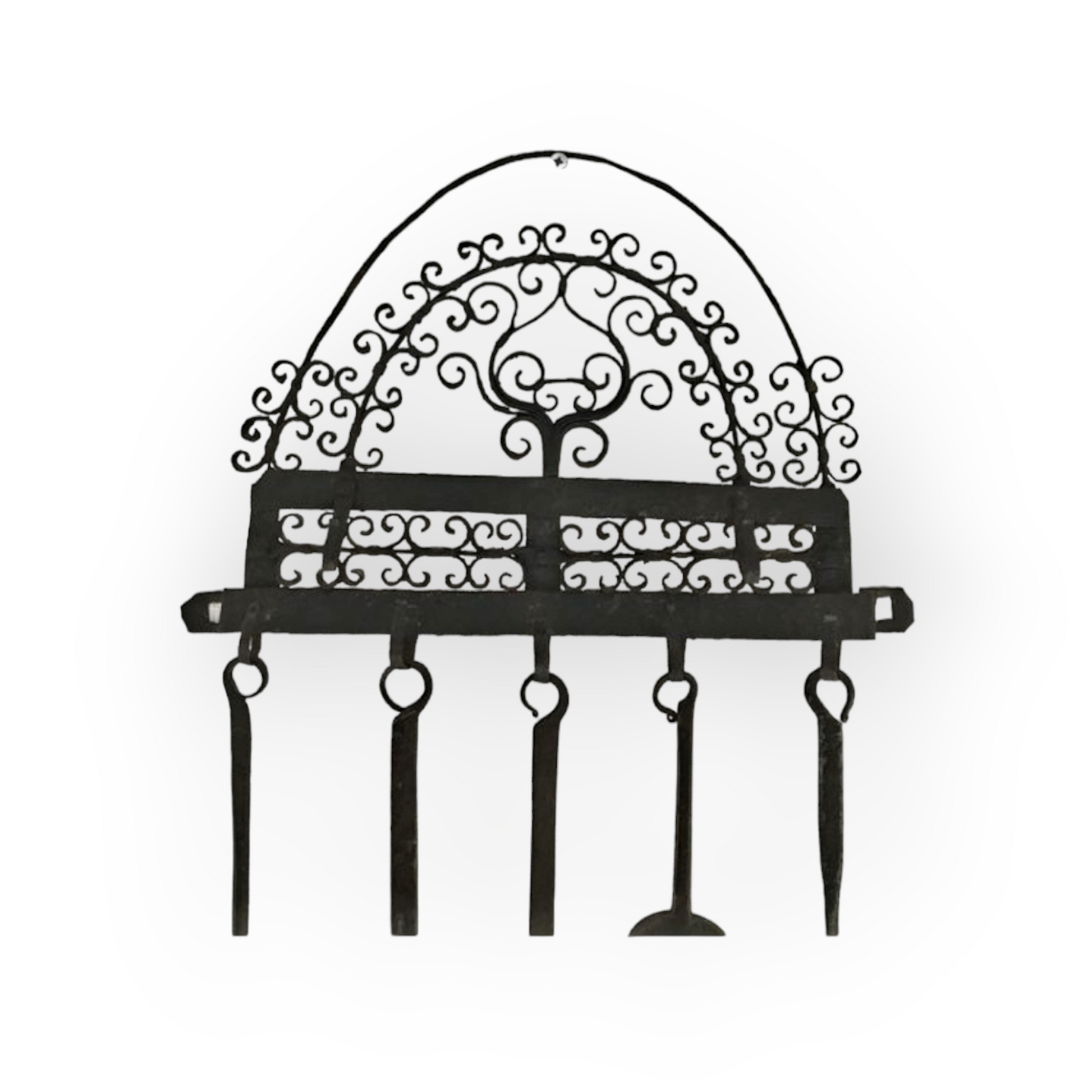 A wonderfully decorative late 17thC antique wrought iron cooking utensil rack with five original antique iron cooking implements.