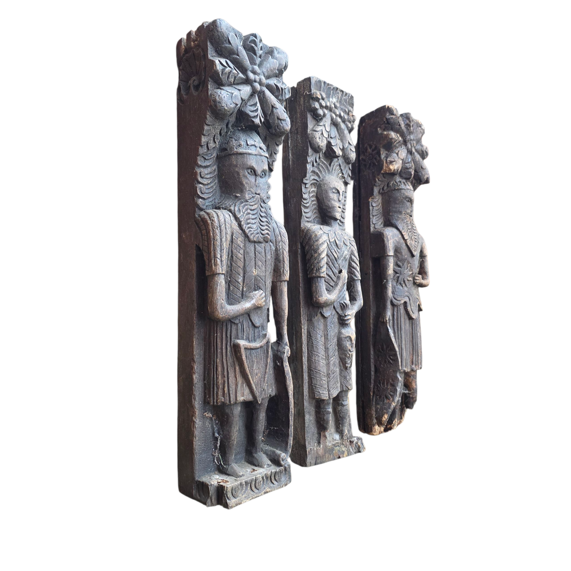 A rare set of three late 16th-century English carved oak figural terms, two panels depicting classical male forms and one as a female with stylised drapery and architectural detailing. These sculptural fragments once adorned a grand domestic or ecclesiastical interior, likely serving as decorative supports or embellishments within a Tudor or Elizabethan setting.