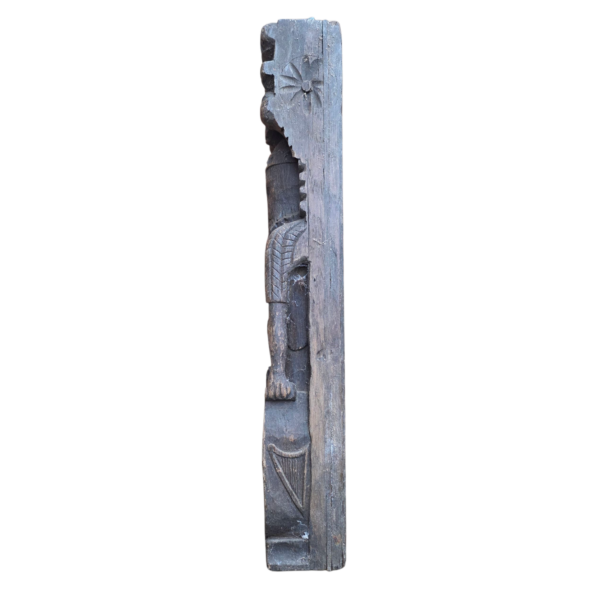 Carved from solid English oak, the panels retain traces of original tooling and exhibit deep relief work typical of the period, with symbolism. One figure bears two harps, one carries a head and the third has incised sunbusts carved into its surface.