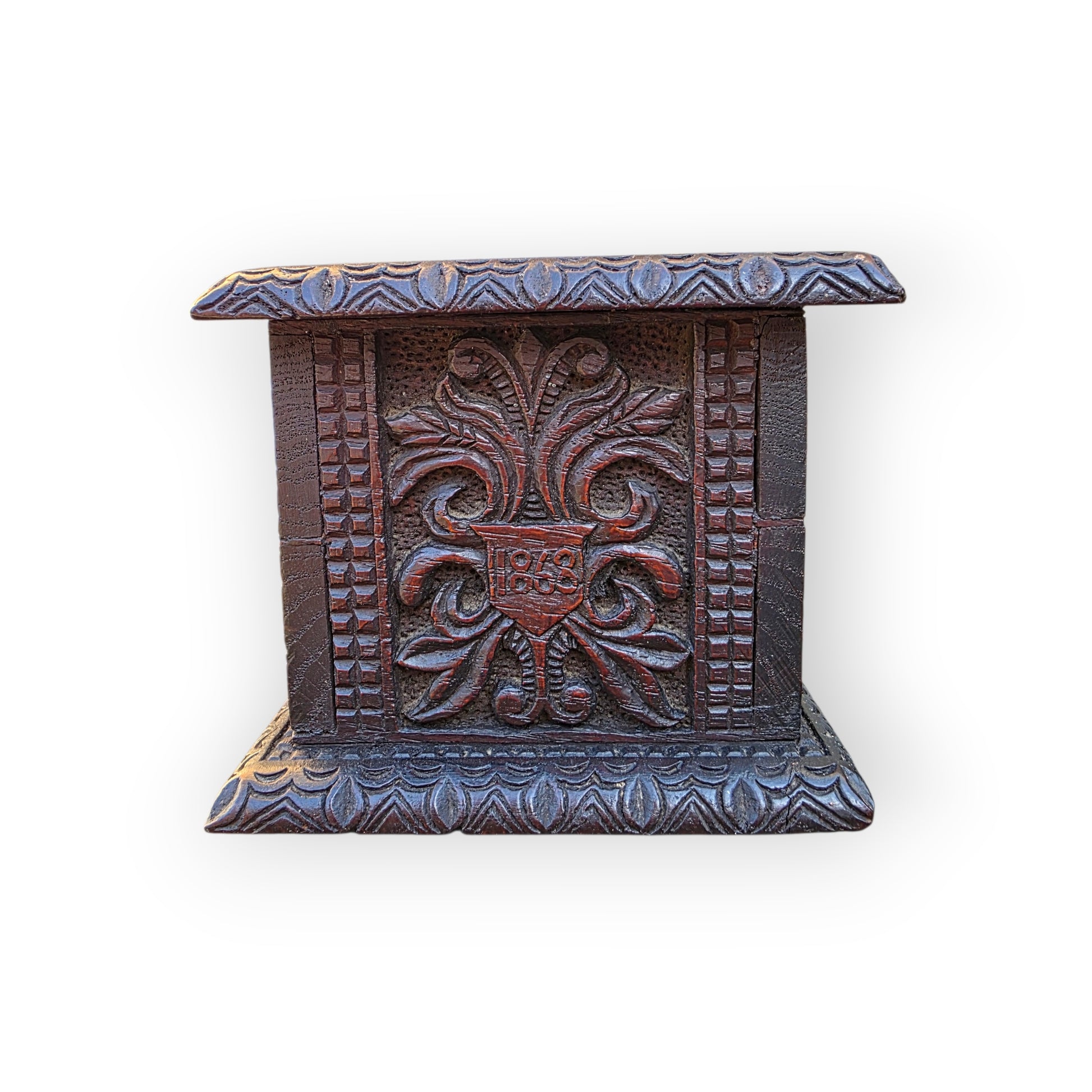 A deeply characterful and historically resonant mid‑19th‑century English carved oak box, modest in scale yet rich in narrative, fashioned from 14th‑century timbers salvaged from York Minster following the devastating 1868 fire. The survival of this material — already five centuries old at the time — lends the piece a rare and compelling ecclesiastical provenance.